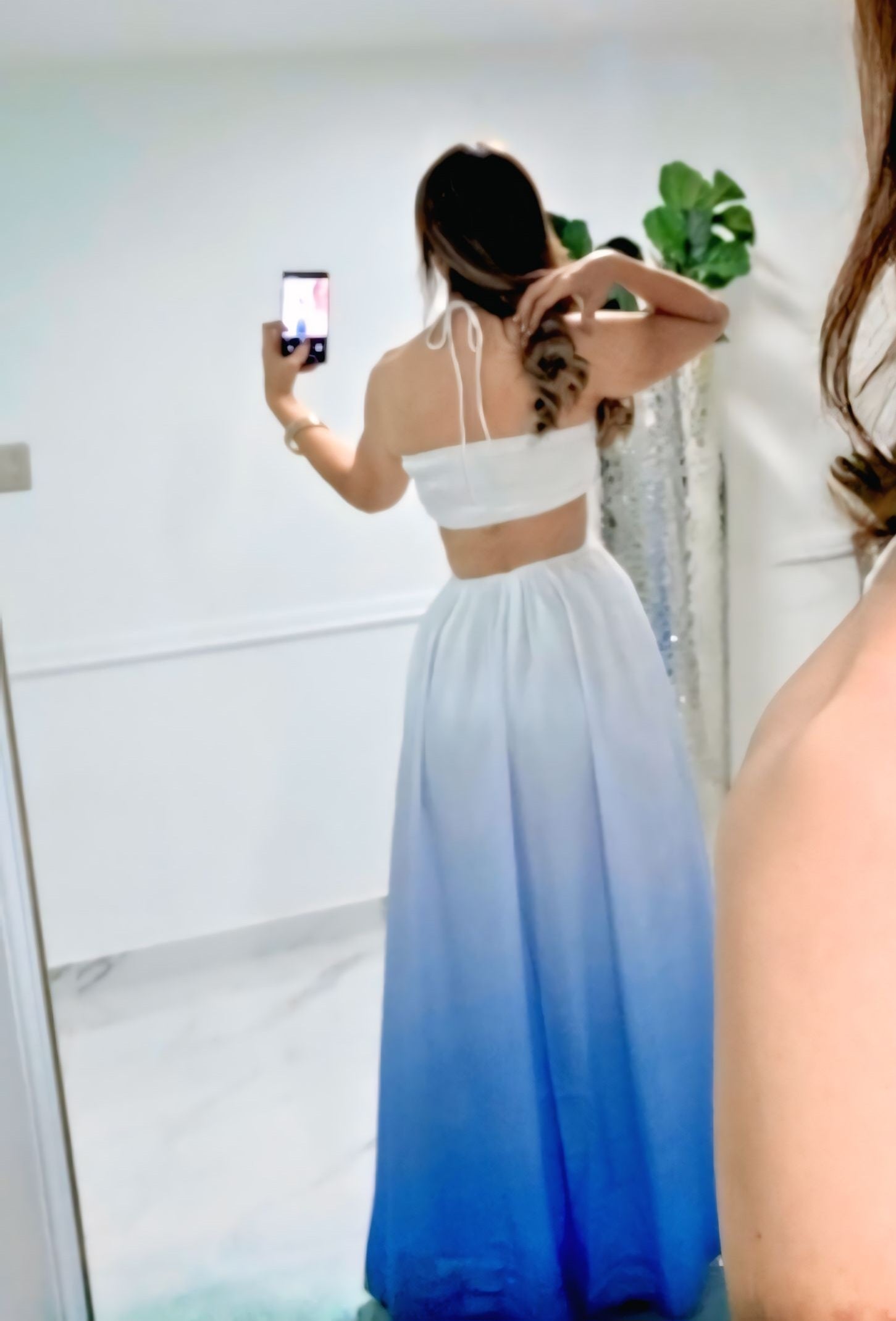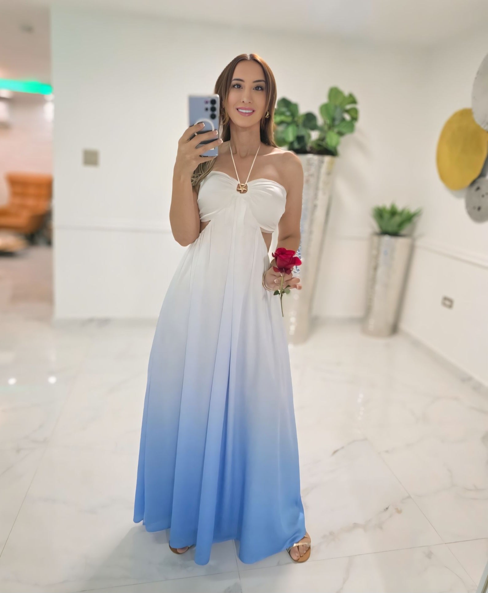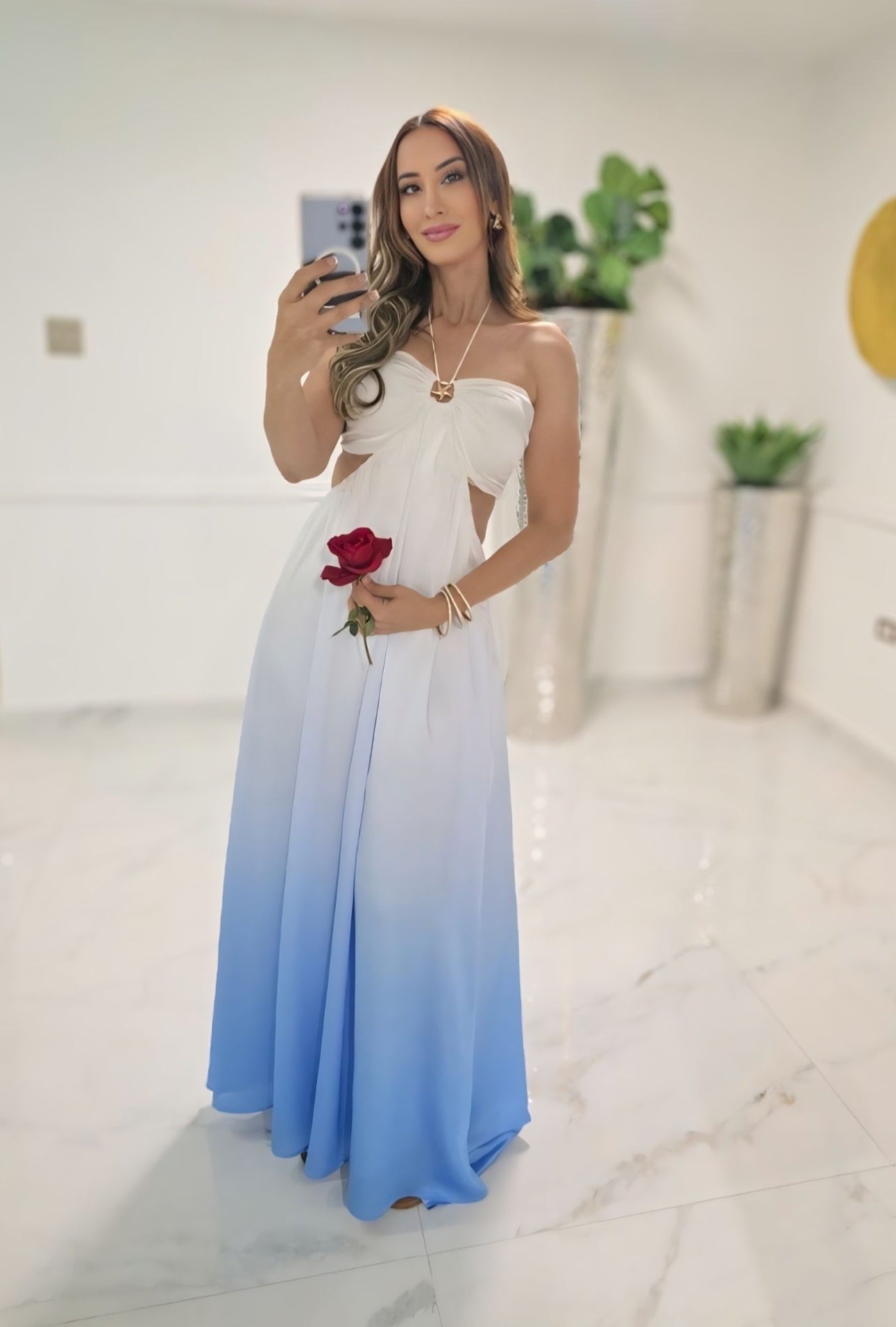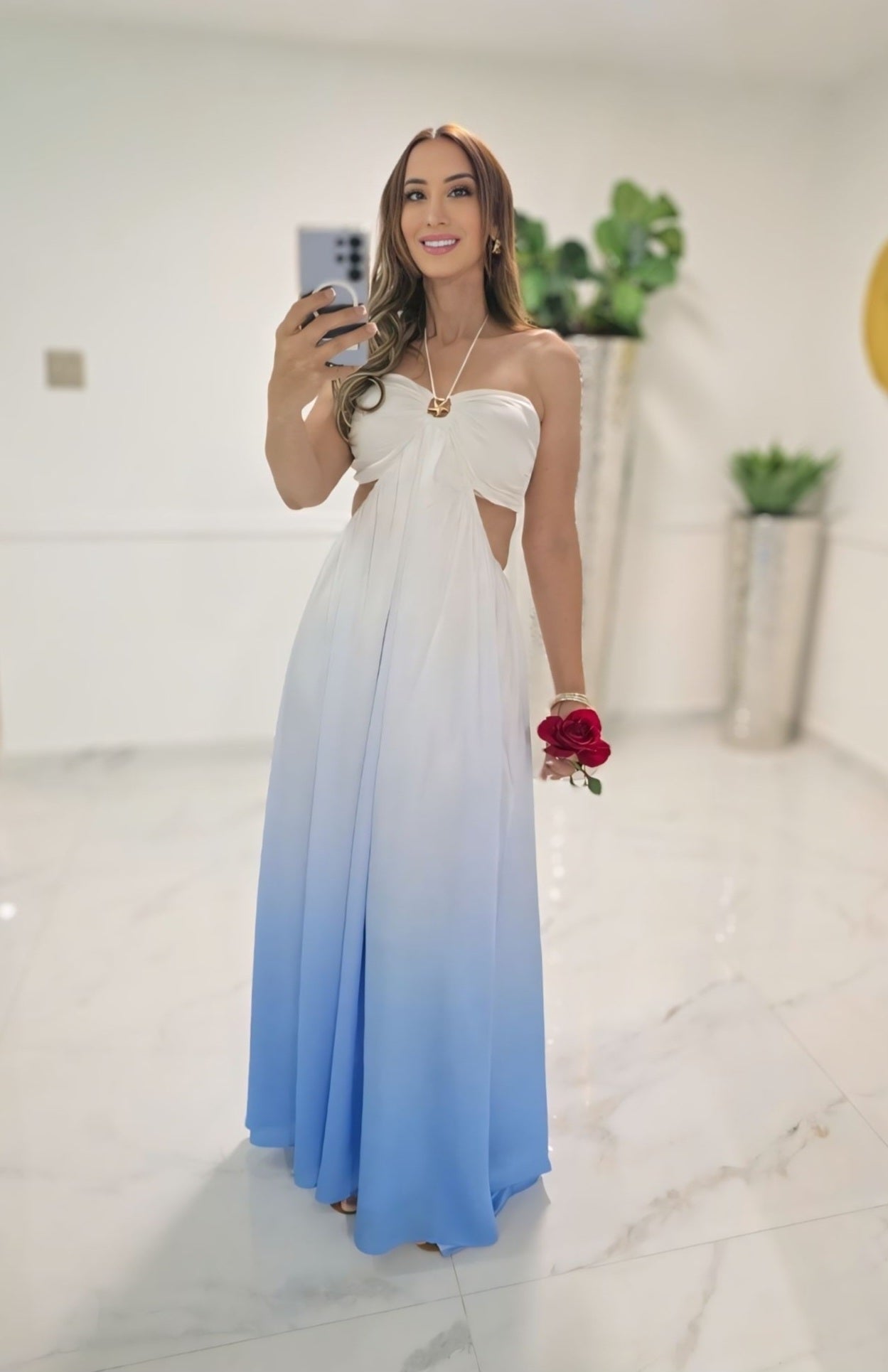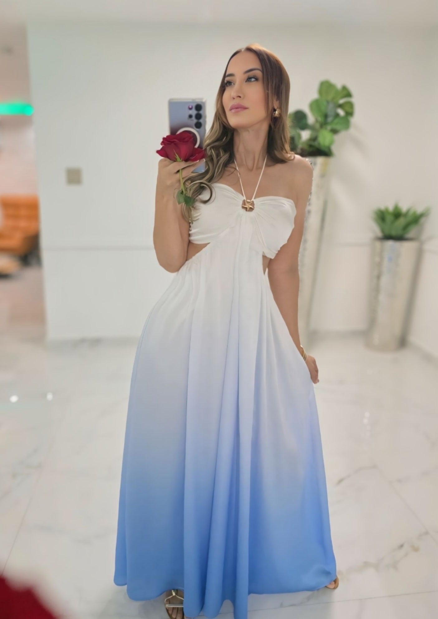 Un diseño etéreo y sofisticado con escote halter y caída fluida en degradé blanco a azul. Su detalle de nudo frontal y aberturas laterales realzan la figura con delicadeza, mientras la falda amplia aporta movimiento y elegancia en cada paso. Una pieza fresca, femenina y perfecta para brillar en eventos, cenas o vacaciones con el toque exclusivo de Costas Boutique.