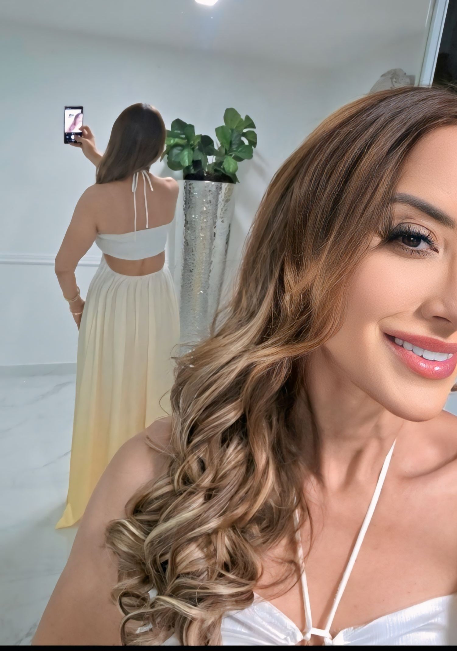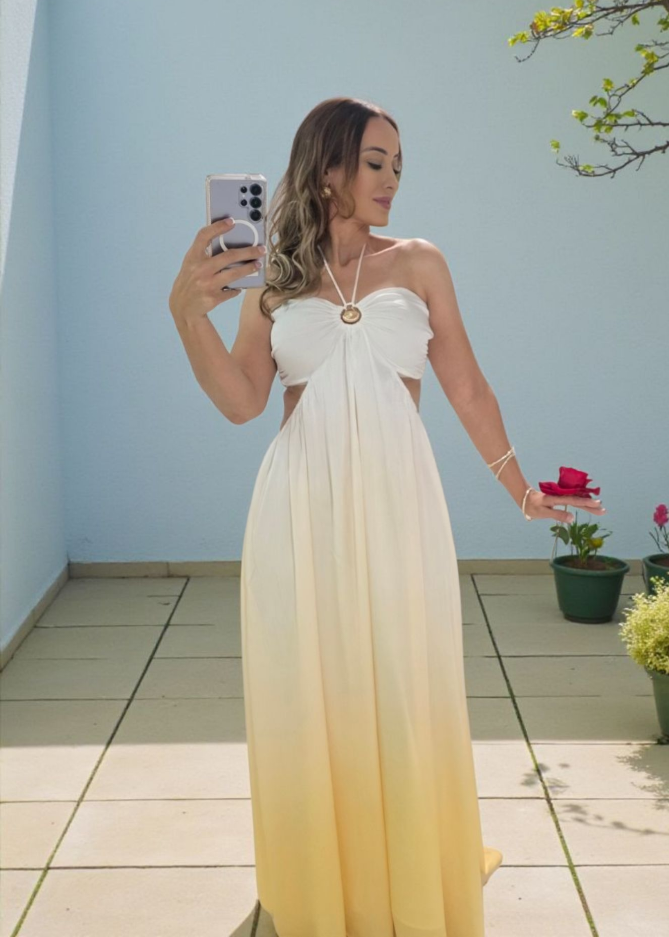 Vestido maxi en blanco que se difumina suavemente a crema y finaliza en un amarillo cálido. Caída fluida, cortes laterales y un estilo fresco que te hace lucir radiante en cada paso.