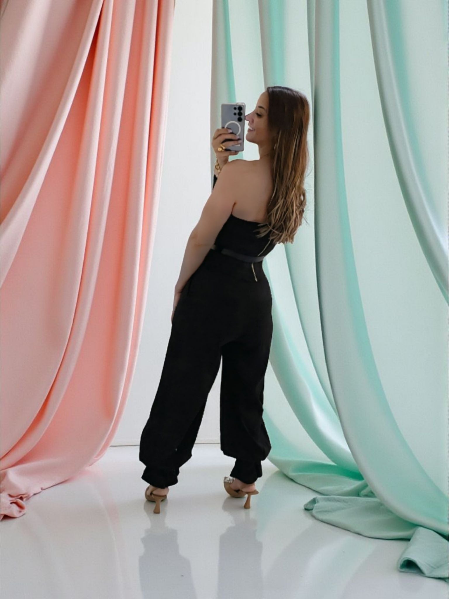 Un conjunto diseñado para destacar con un encanto moderno y una elegancia sutil. Nuestro Black Muse Aladino Set combina un top tipo abanico de estructura impecable con un pantalón estilo aladino que ofrece caída fluida y un detalle único en los tobillos con cintas y perlas decorativas.