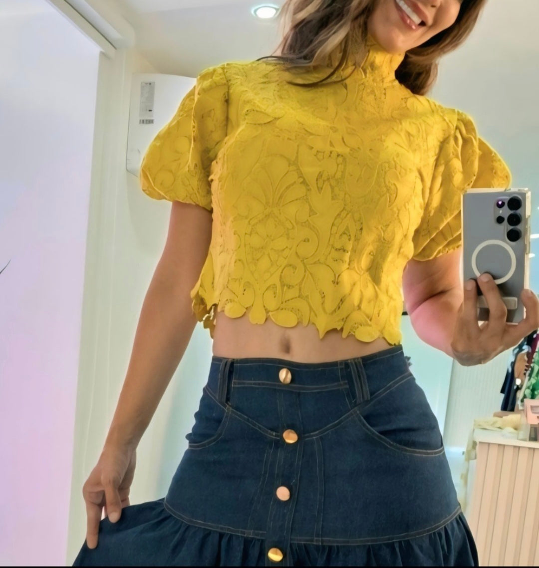 Una pieza sofisticada y radiante que ilumina cualquier look. Esta blusa en tono verde lima destaca por su delicado encaje floral de diseño intrincado, confeccionado en una tela ligera y refinada que aporta frescura y elegancia. Su corte crop realza la silueta con un toque moderno, mientras que el cuello alto festoneado y las mangas abullonadas añaden un aire romántico y chic. El dobladillo en ondas, con terminación en encaje, la convierte en una prenda exclusiva y versátil, ideal para combinar con faldas o pantalones de tiro alto.