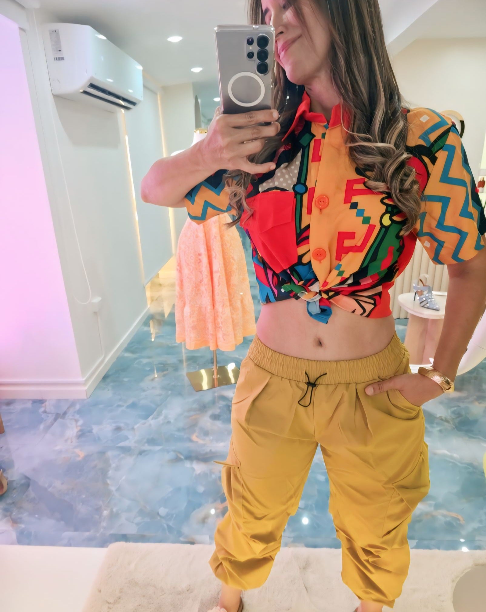 pieza vibrante y llena de energía que fusiona patrones geométricos y colores intensos en un diseño moderno y juvenil. Confeccionada en tela ligera y fresca, cuenta con botones frontales y manga corta, ideal para usarla suelta o anudada al frente para un look más atrevido. Perfecta para combinar con pantalones básicos, denim o joggers, convirtiéndose en la protagonista de cualquier outfit.