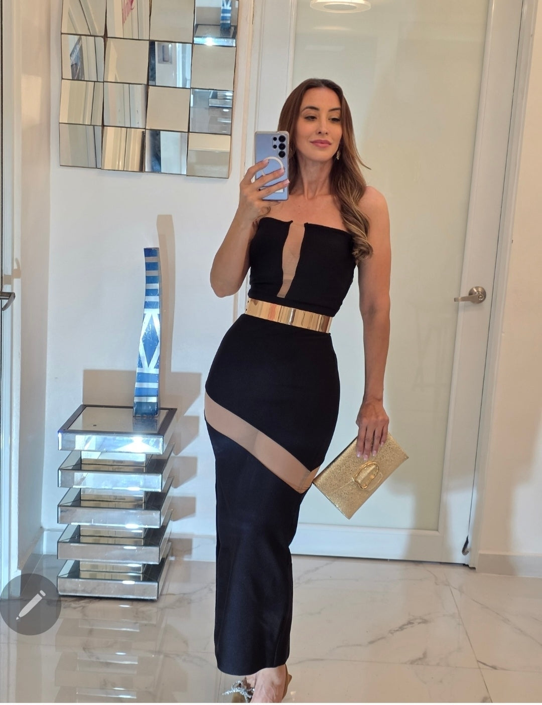 La falda abraza la silueta con un detalle asimétrico en mesh que realza las curvas con modernidad y un toque artístico. Su protagonista es el cinturón rígido en metal dorado, una pieza tipo joya que marca la cintura con un brillo couture que transforma el look por completo.