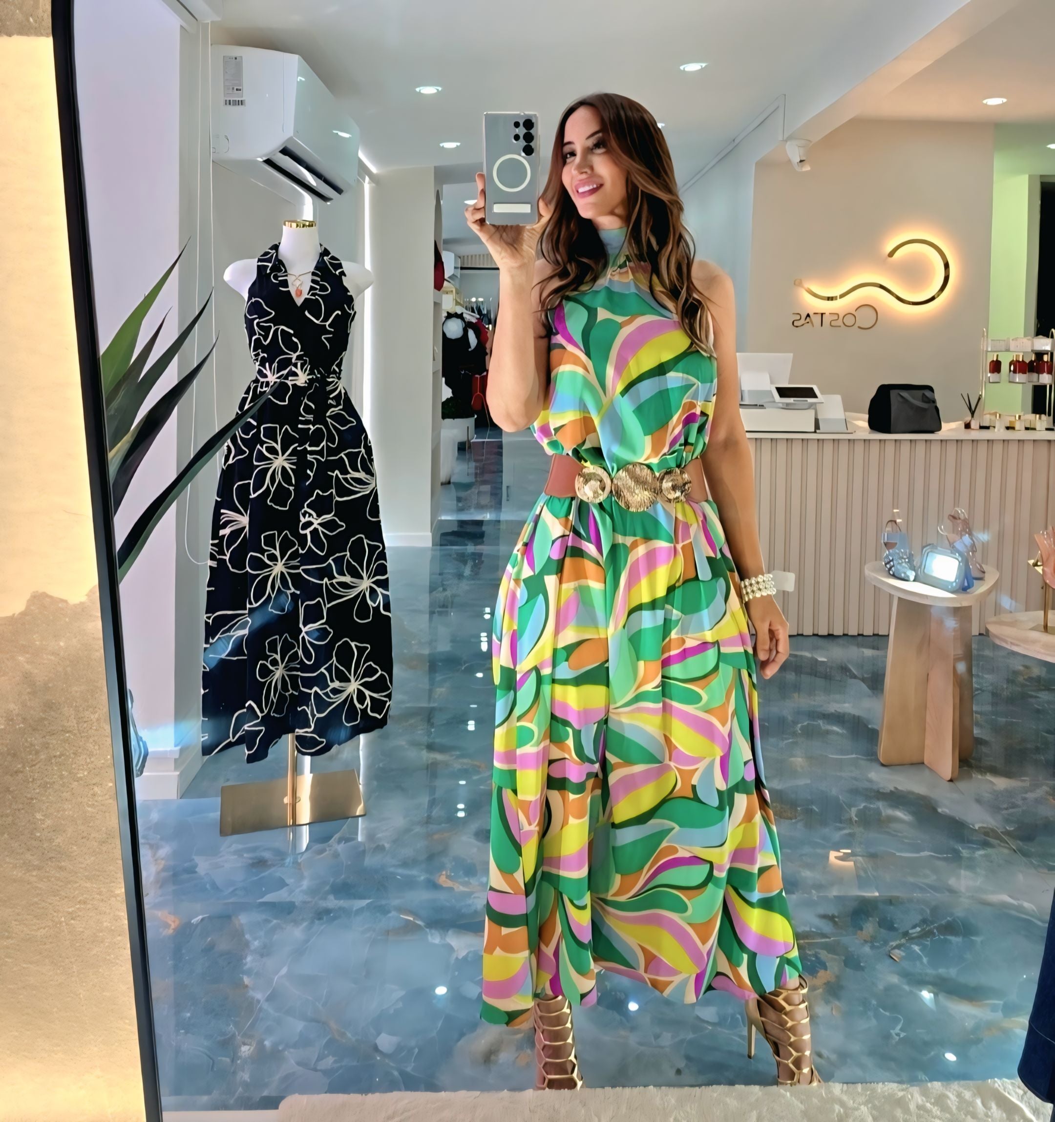 estampado vibrante mezcla verde y café otoñal con toques de color que iluminan, logrando un balance perfecto entre frescura y elegancia.Llévalo suelto y fluido o añade cinturón para resaltar tu silueta. Dos estilos en una sola pieza.