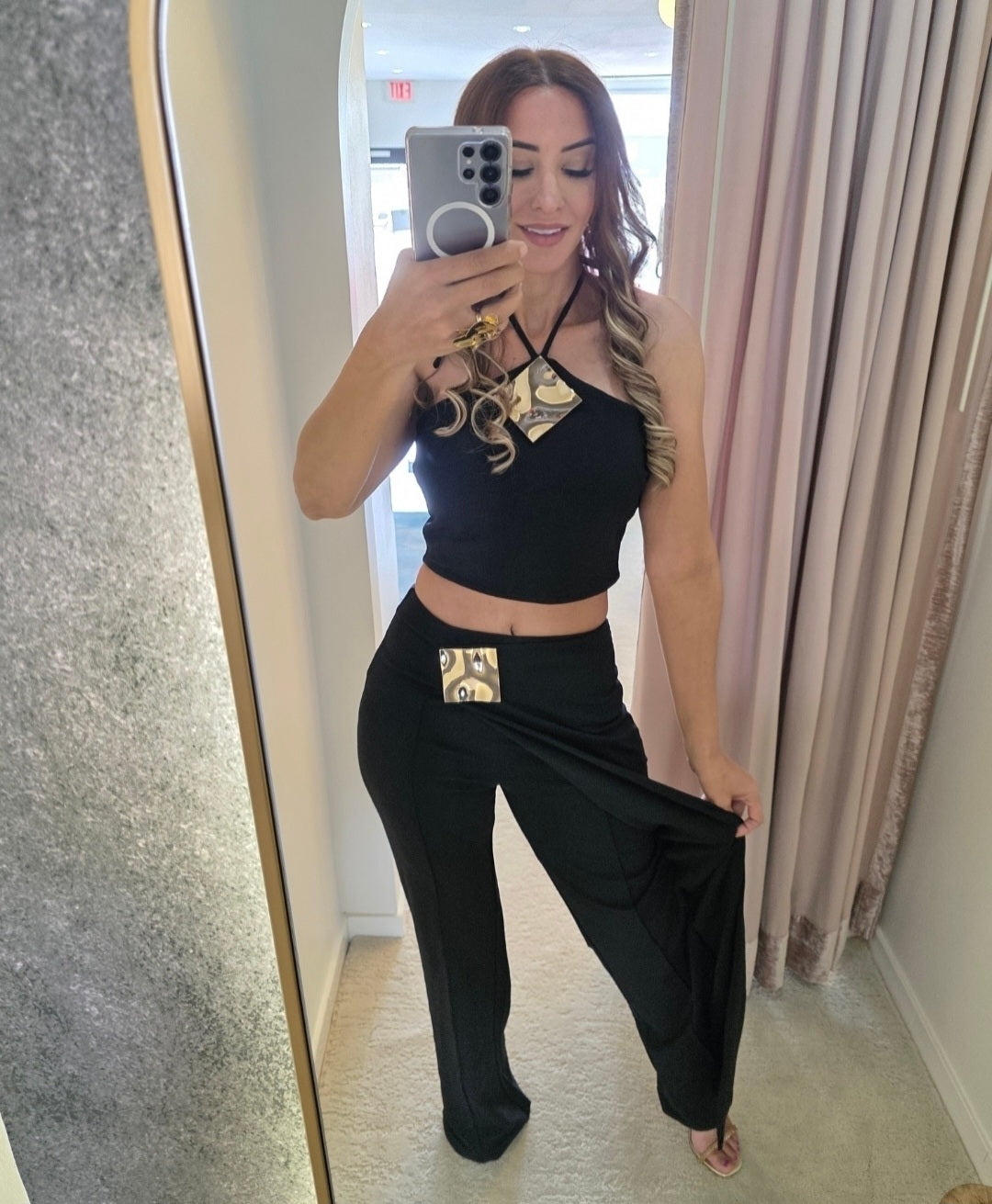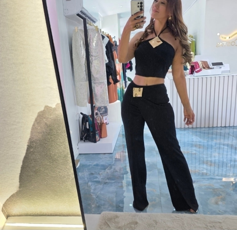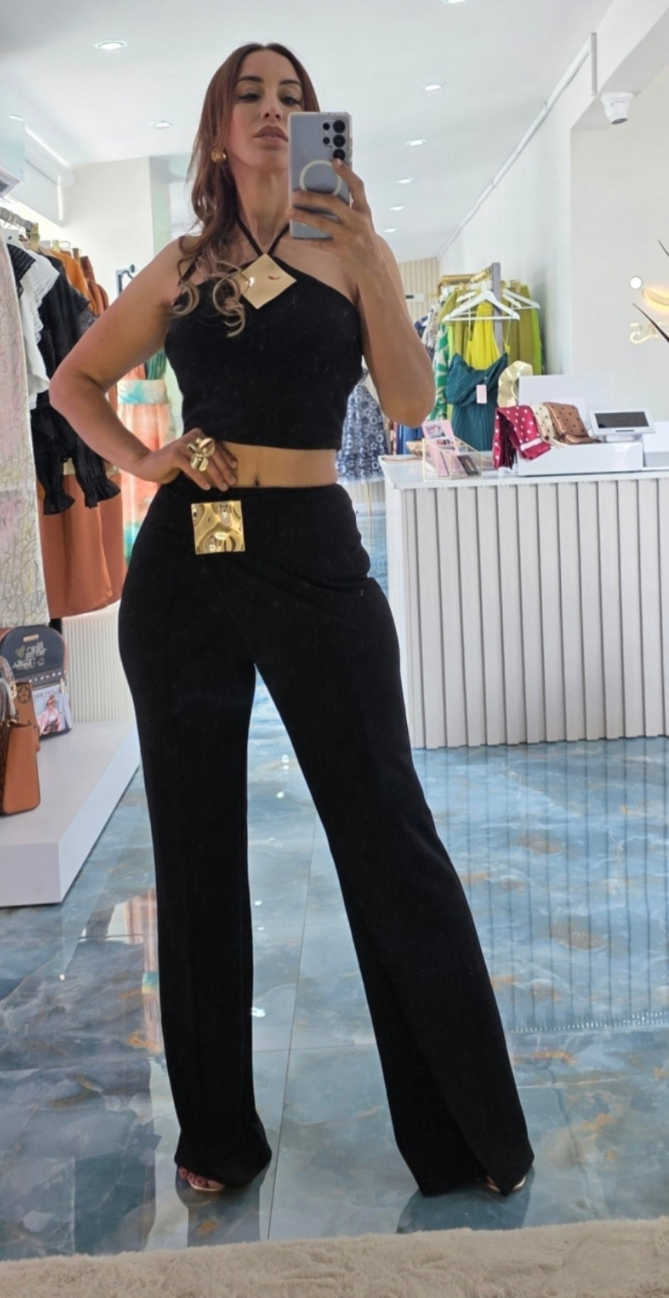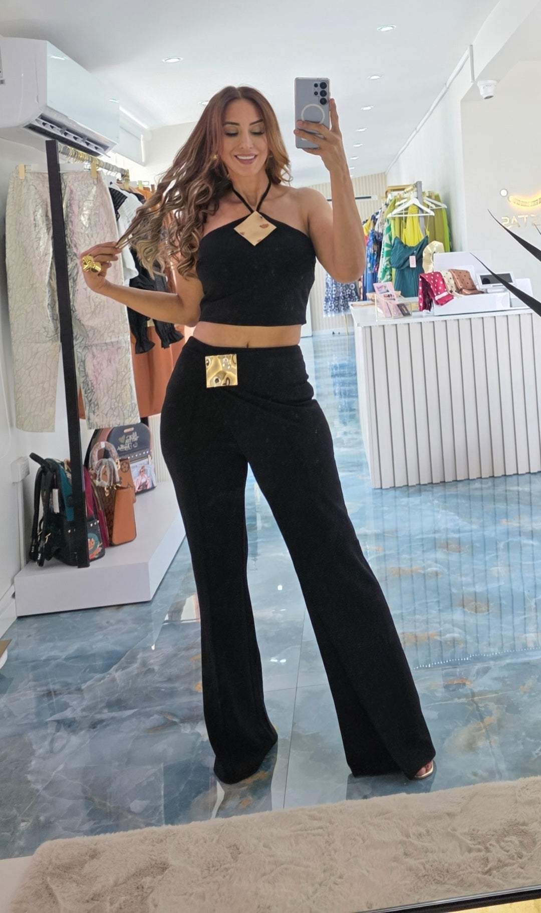 Elegancia que brilla con actitud ✨ El Golden Edge Set combina modernidad y glamour con su diseño negro profundo y detalles dorados que capturan la luz y la atención. Su top halter realza los hombros con un toque sofisticado, mientras el pantalón de corte fluido estiliza la figura con un diseño cruzado y una placa metálica que acentúa la cintura.