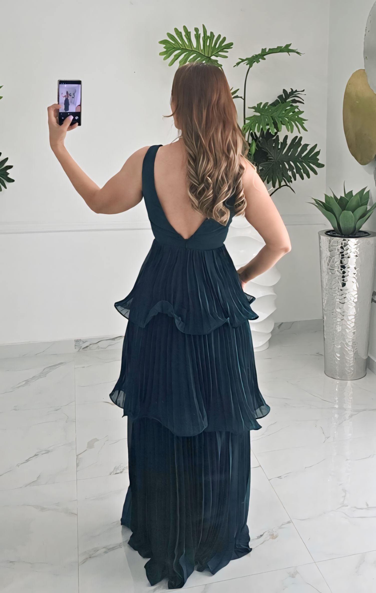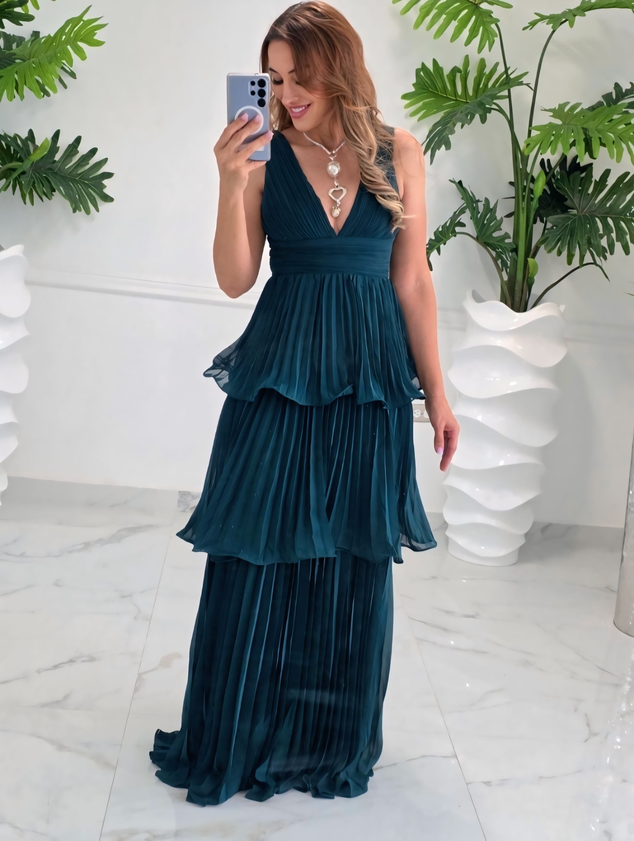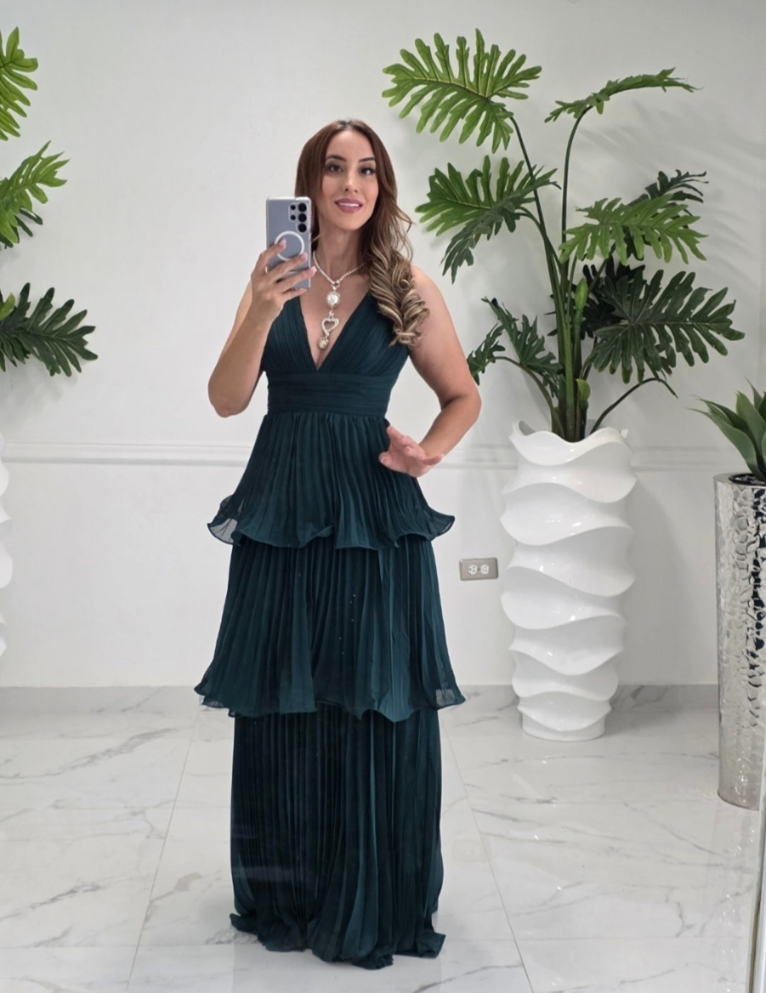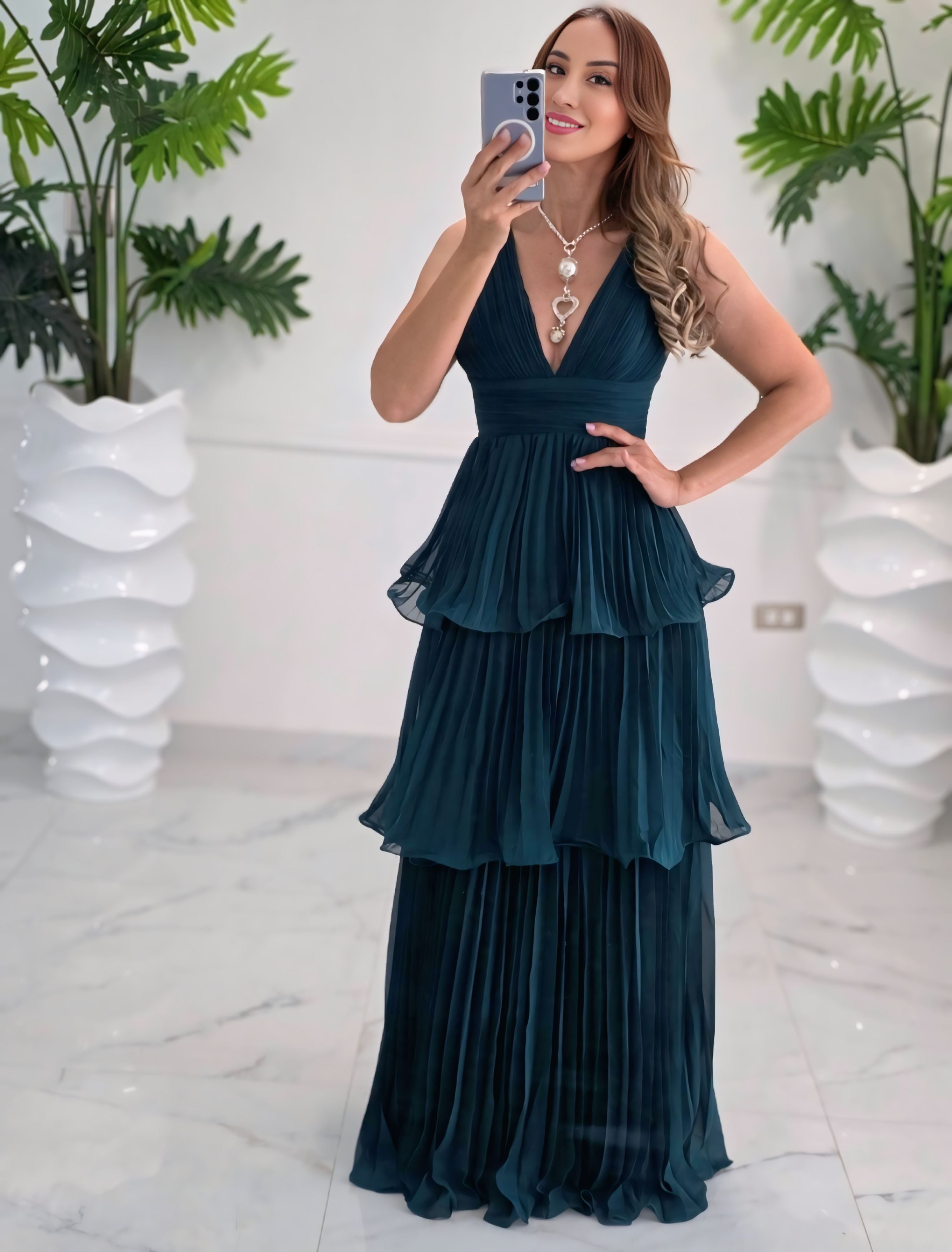 Descubre la elegancia en movimiento con el Emerald Cascade Gown, un vestido de caída ligera y pliegues finos que estiliza la figura con un encanto sofisticado. Su diseño en capas plisadas crea un efecto de cascada espectacular, mientras su escote en “V” realza con clase la zona del busto.