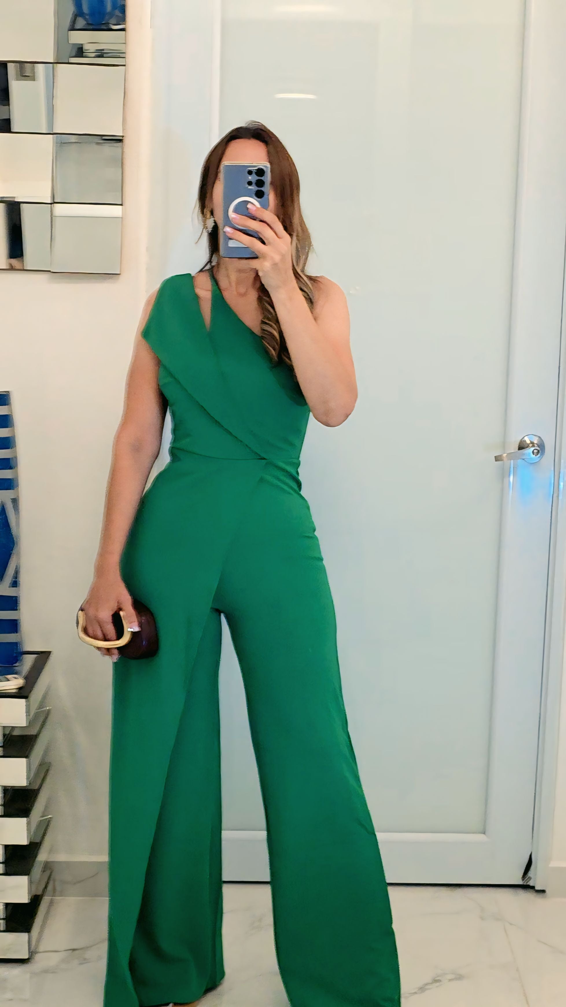 El Emerald Grace Jumpsuit es la definición de elegancia moderna. Su diseño asimétrico de un solo hombro crea una silueta sofisticada, mientras el drapeado frontal añade un toque couture que estiliza y realza la figura.