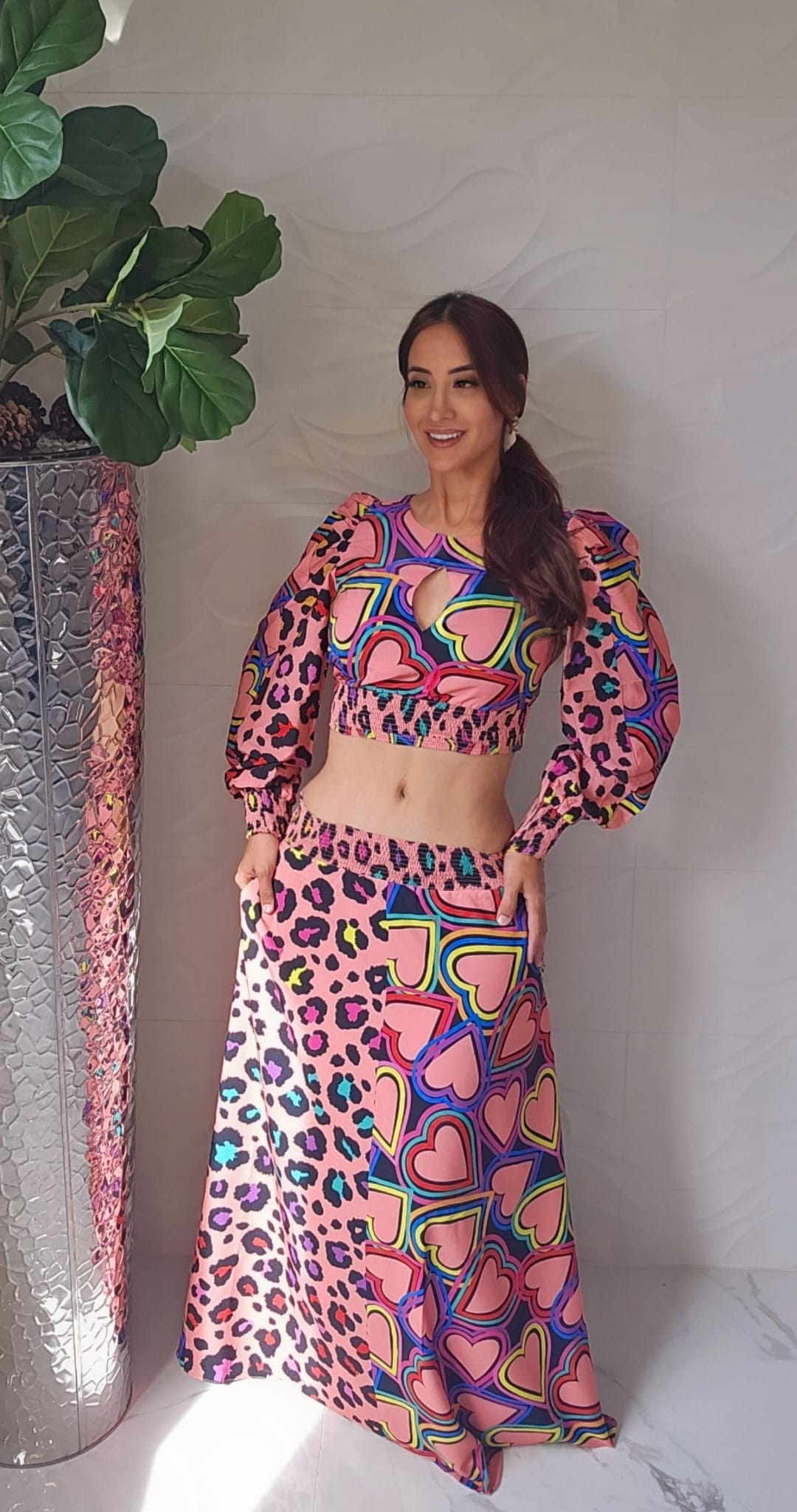 Conjunto de dos piezas vibrante y elegante que combina corazones multicolores y un diseño moderno. Incluye un top crop con mangas abullonadas y escote en lágrima, acompañado de una falda larga fluida. Perfecto para destacar con estilo y confianza en cualquier ocasión.