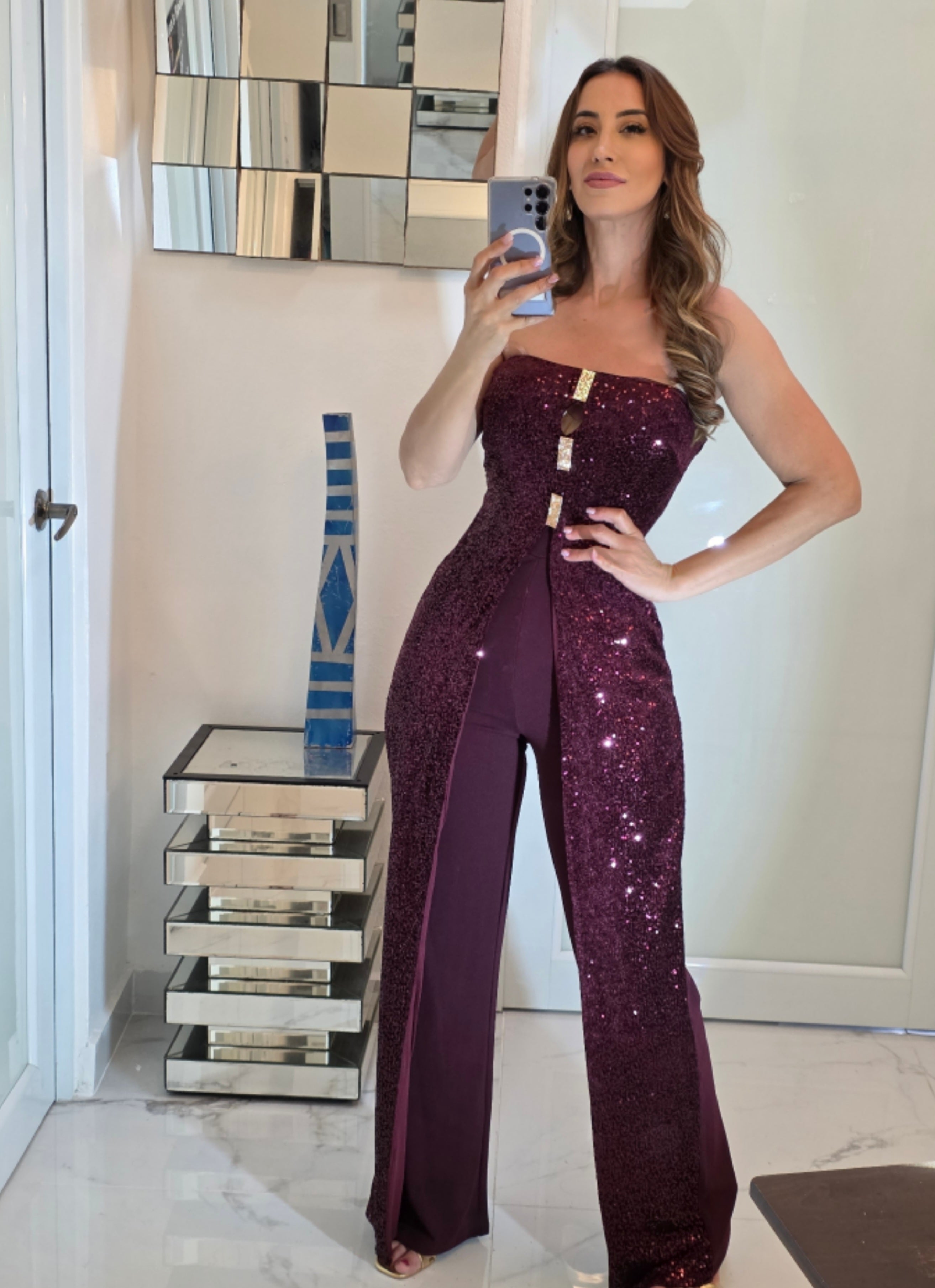Un jumpsuit diseñado para reinar. Imperial Wine Majesty combina un brillo exquisito en lentejuelas tono vino profundo con un corte estructurado que estiliza la figura al instante. Su diseño strapless, realzado con accesorios dorados frontales, aporta sofisticación y un toque de lujo moderno.
