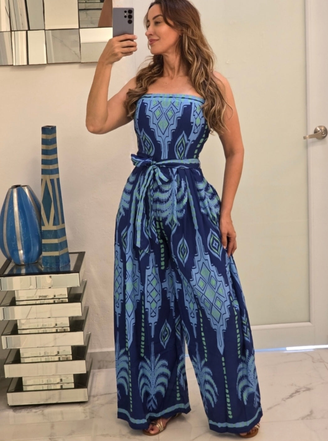 Déjate llevar por la elegancia fresca del verano con este hermoso jumpsuit strapless en tonos azul profundo y aqua, con un print geométrico y tropical que estiliza la figura. Su diseño tipo corset realza el busto y define la cintura, mientras que el pantalón palazzo aporta movimiento, comodidad y un look sofisticado. Incluye cinturón del mismo tejido para un ajuste perfecto.