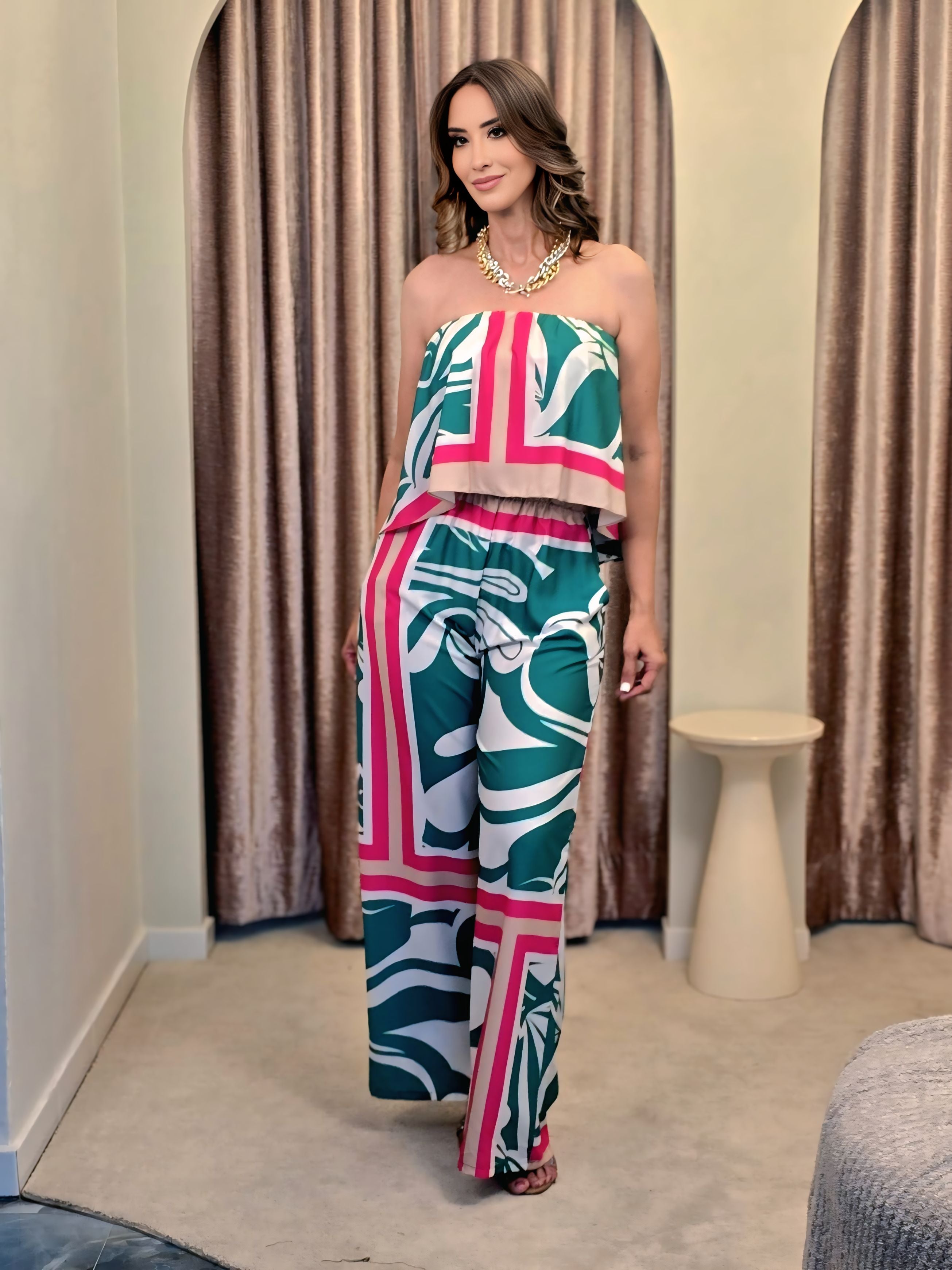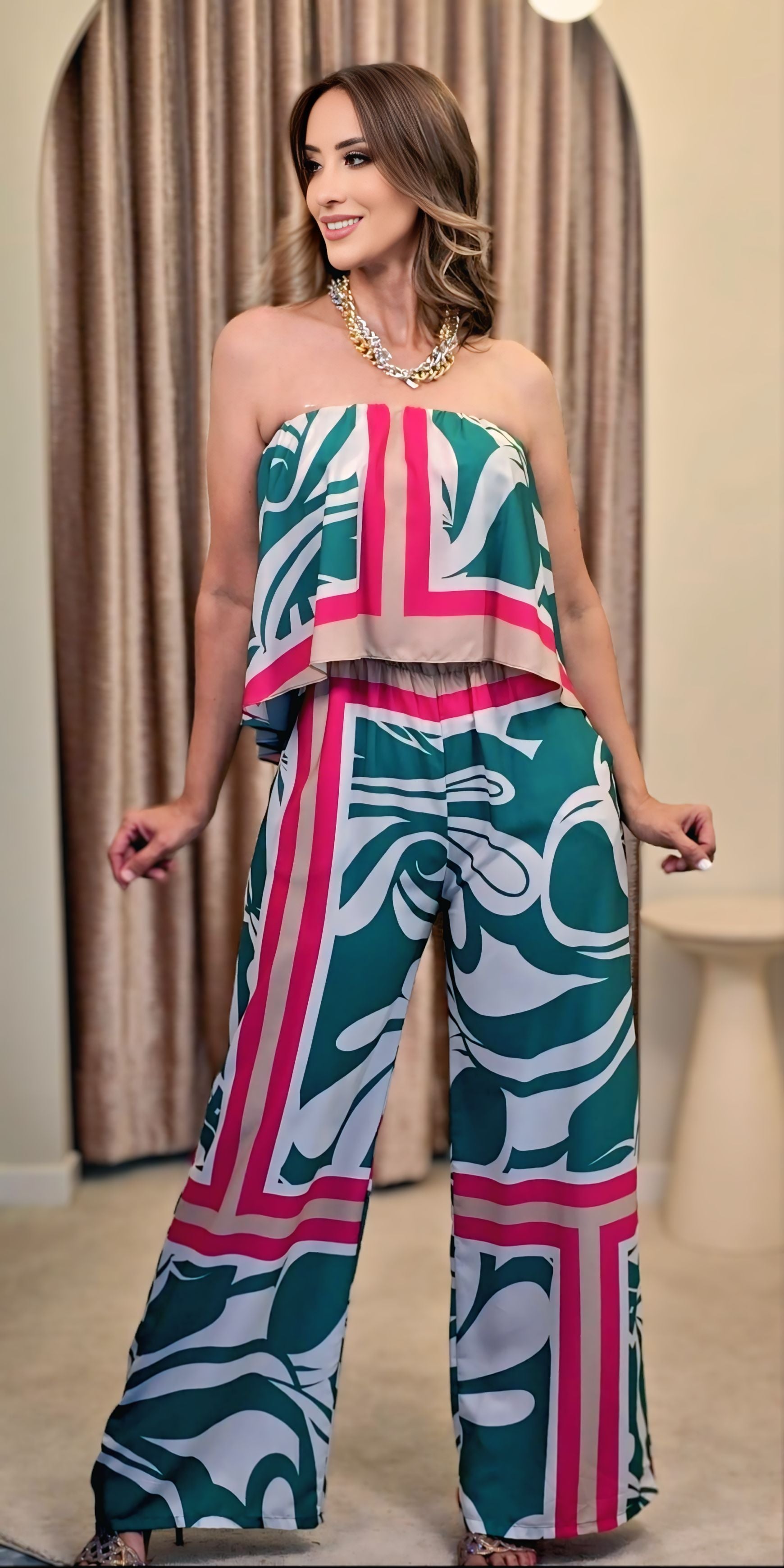 Estampado geométrico en tonos verde esmeralda, fucsia y blanco que roban miradas.