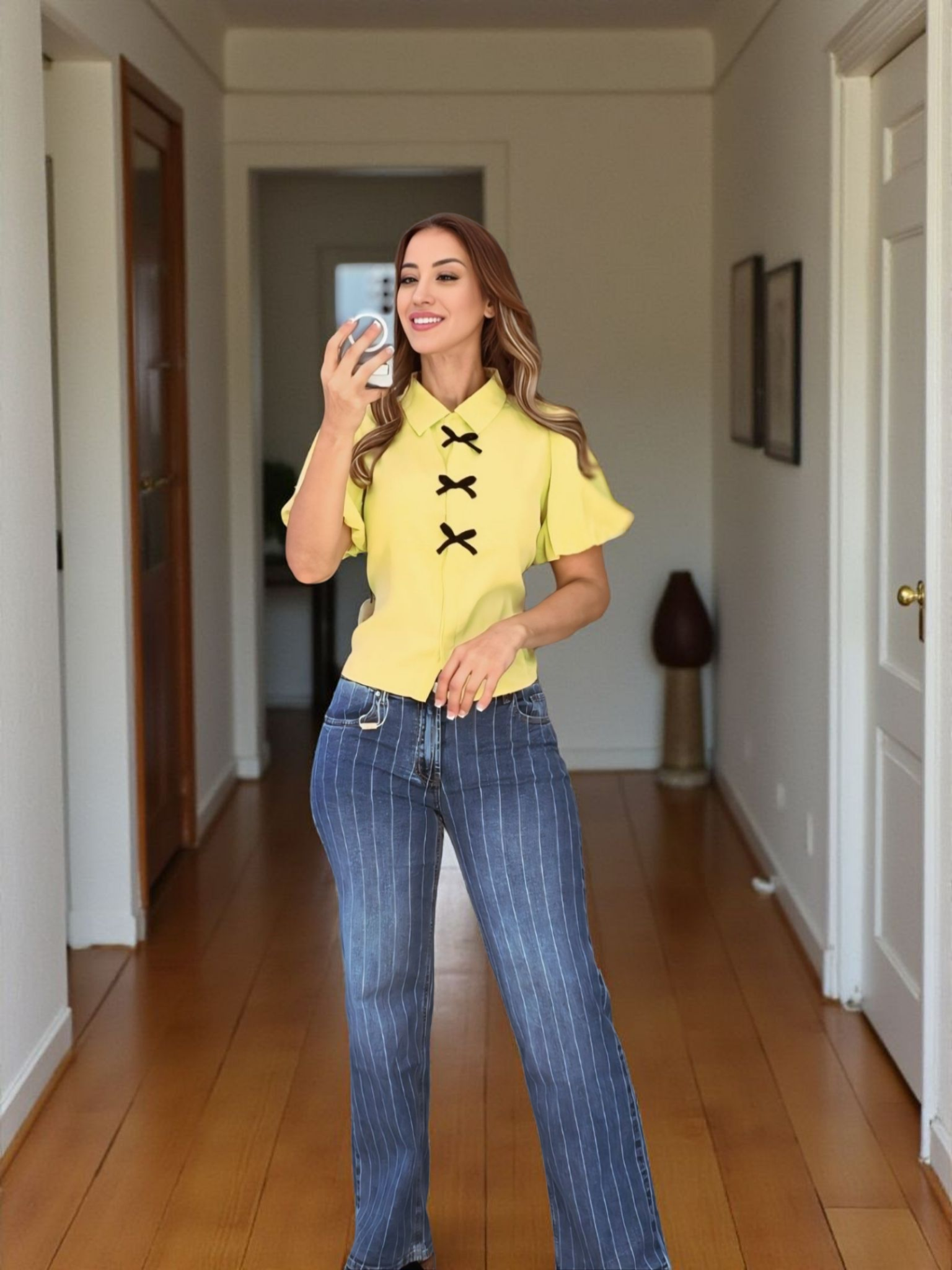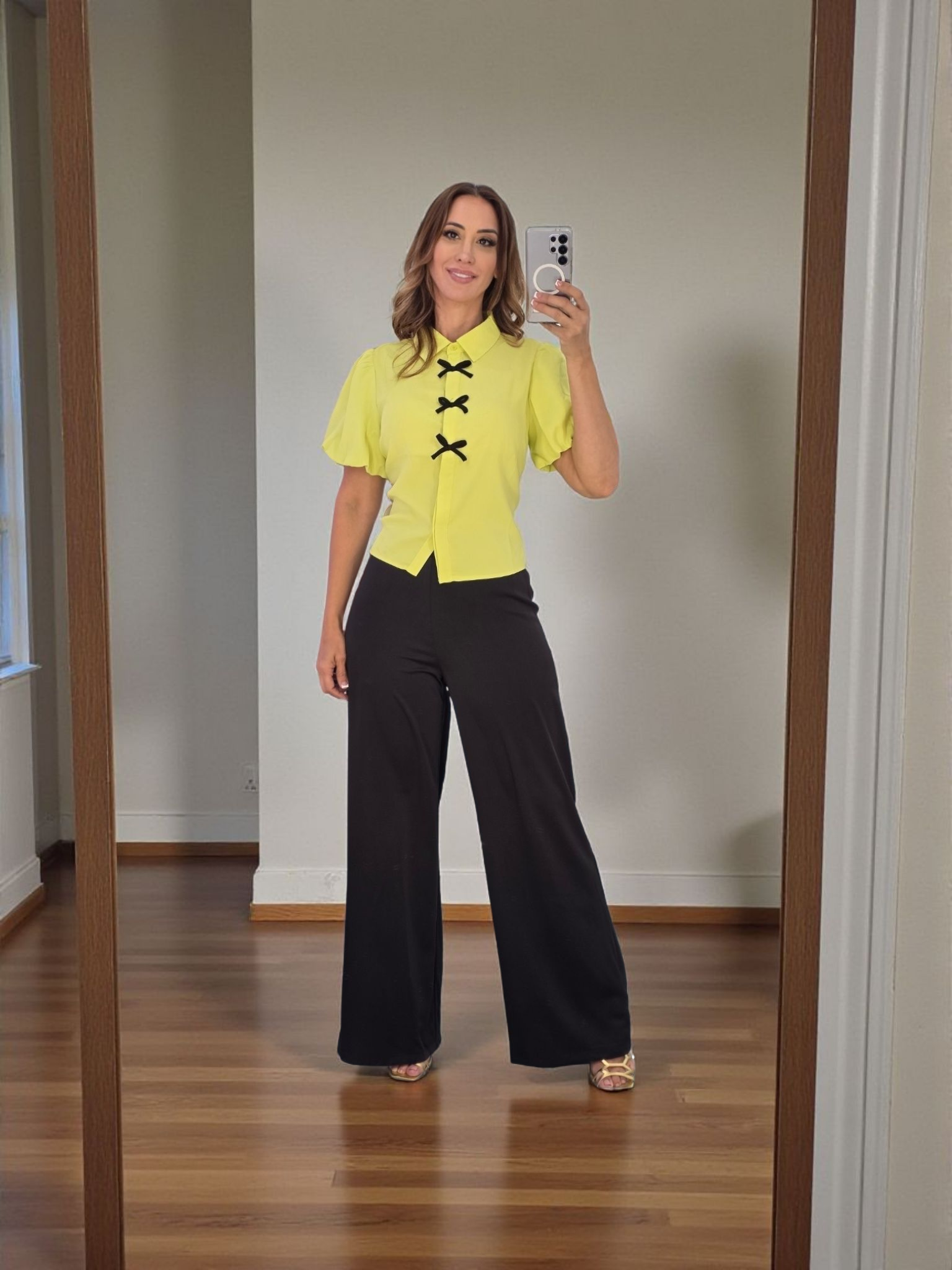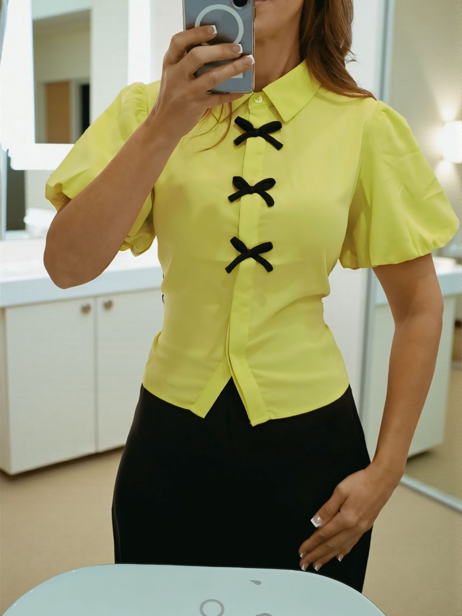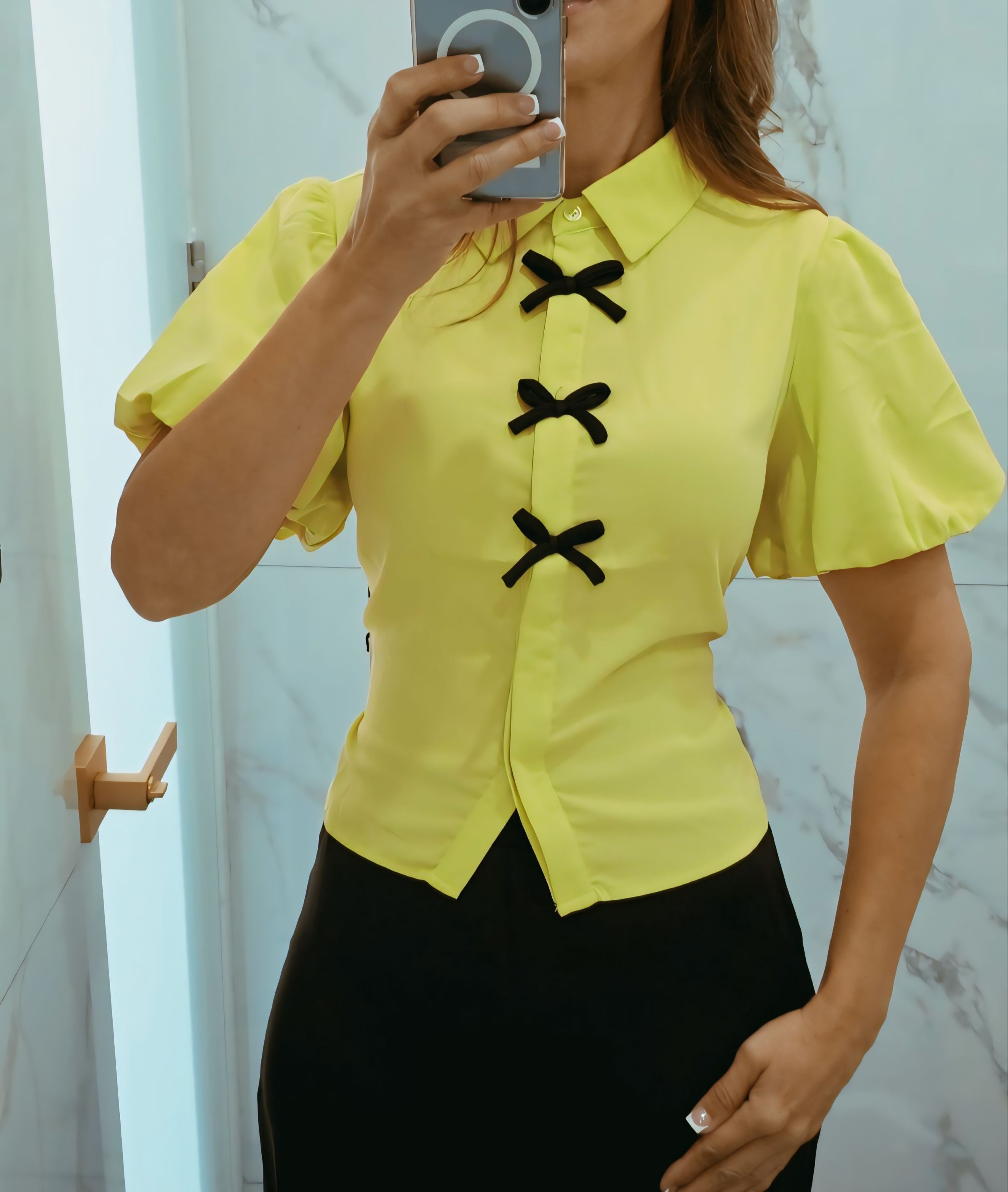 Elegante y moderna en tono amarillo lima, con mangas abullonadas y lazos negros frontales que realzan la silueta con un toque chic.
