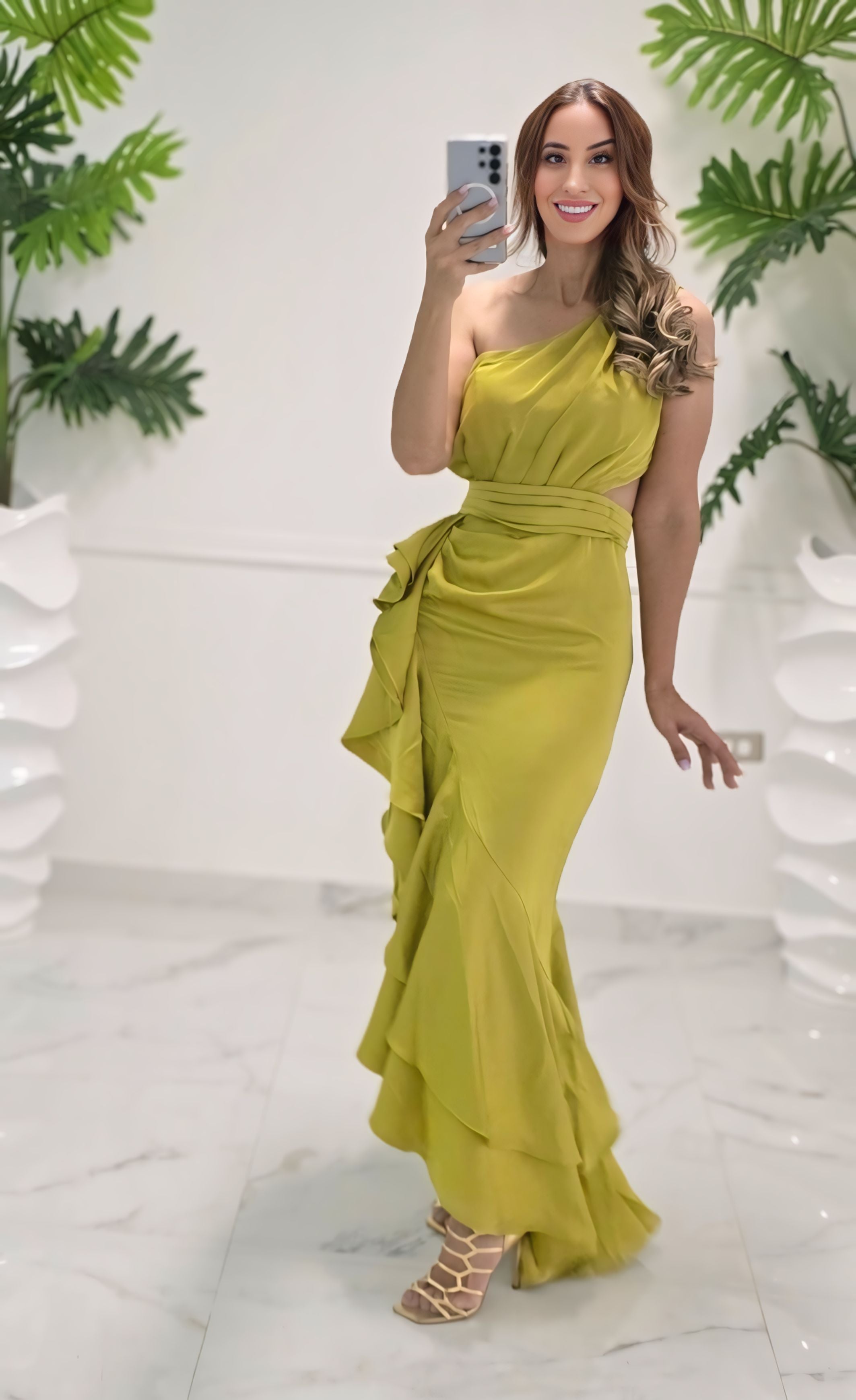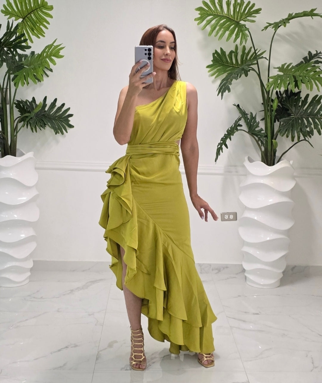 El Lime Ruffle Satin es un vestido asimétrico en satín verde lima que roba miradas al instante. Su caída elegante, el detalle drapeado en un solo hombro y los volantes que recorren la falda crean un movimiento sofisticado y femenino. La abertura añade un toque moderno sin perder la clase.