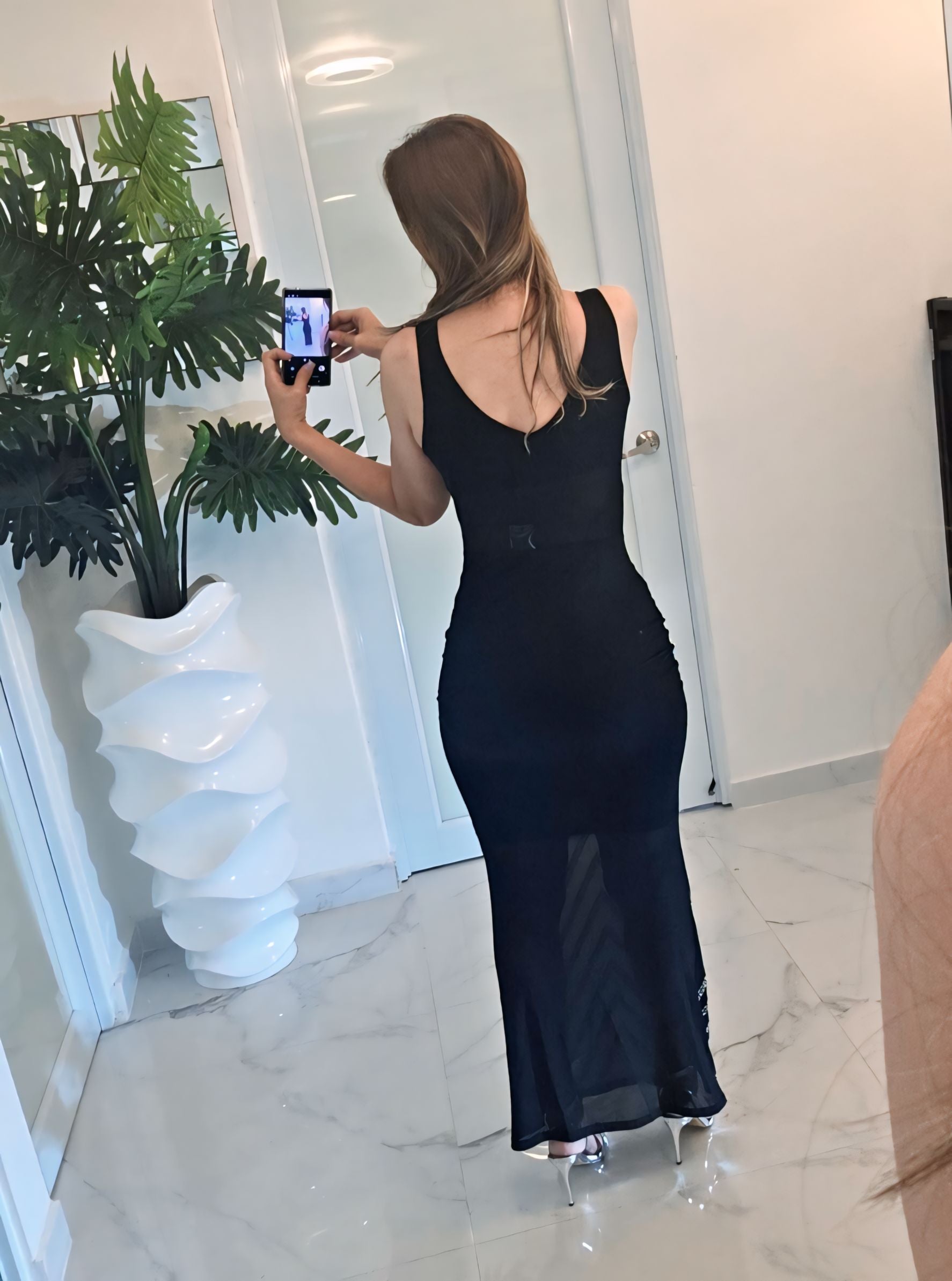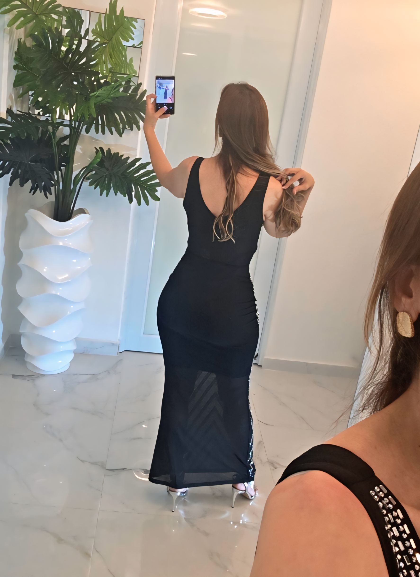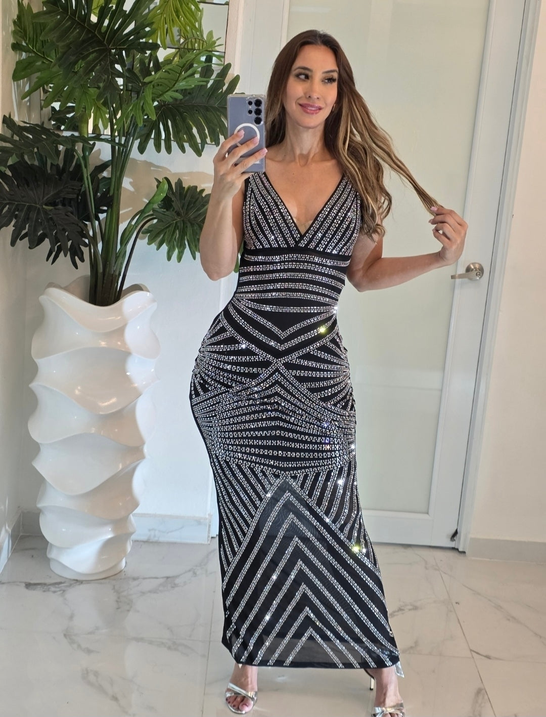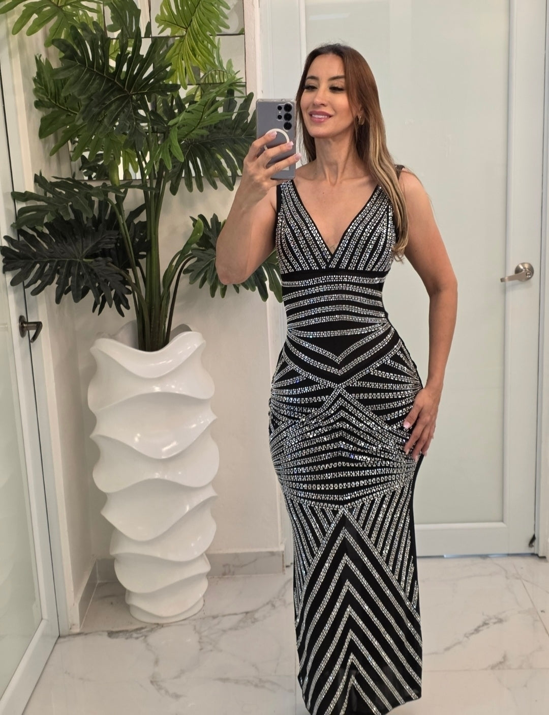 Lumière Éternelle es una declaración de elegancia absoluta. Un vestido diseñado para mujeres que entran con seguridad y dejan huella. Su base negra profunda se convierte en un escenario perfecto para un trabajo minucioso de rhinestones luminosos, colocados en patrones geométricos que estilizan la figura y crean un efecto de lujo continuo, como luz que nunca se apaga.