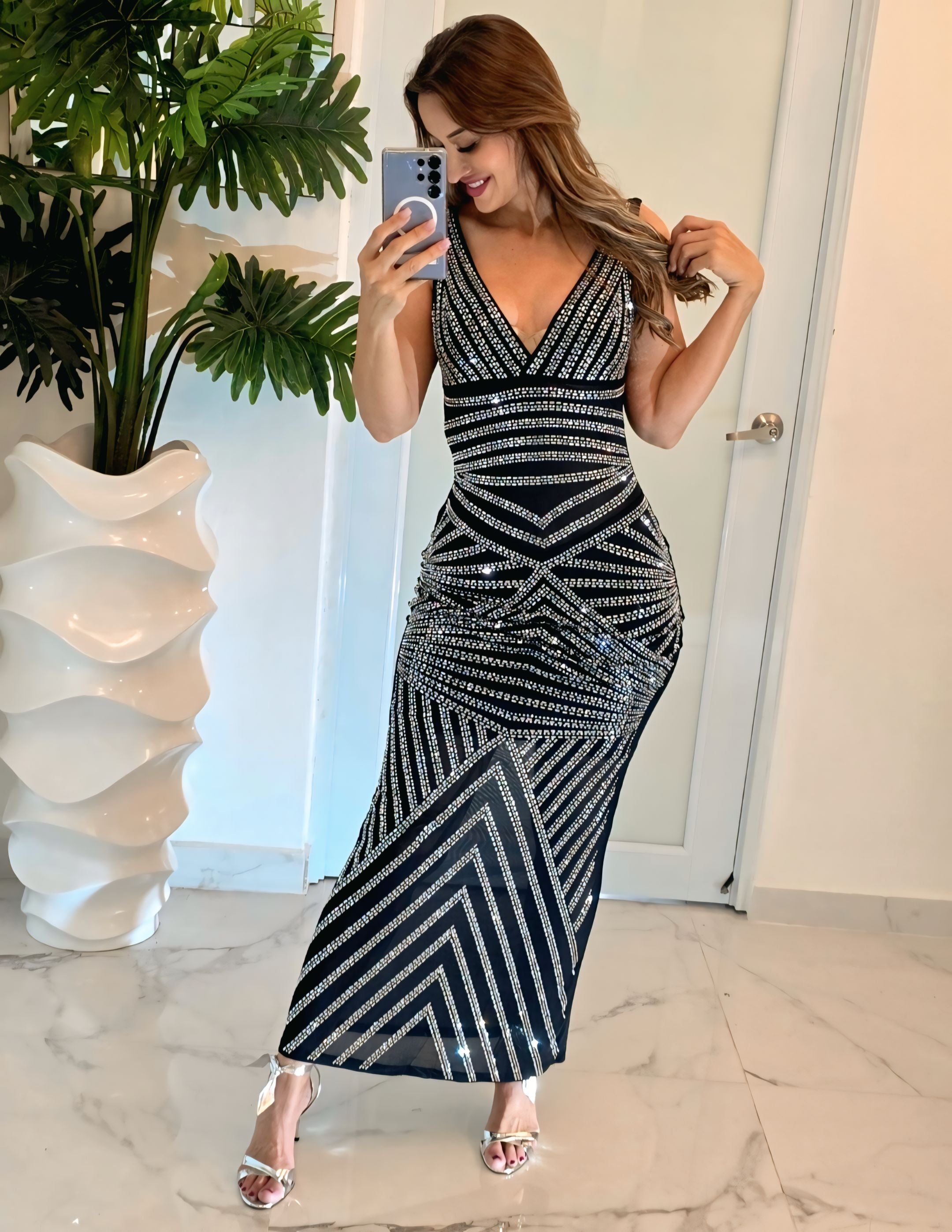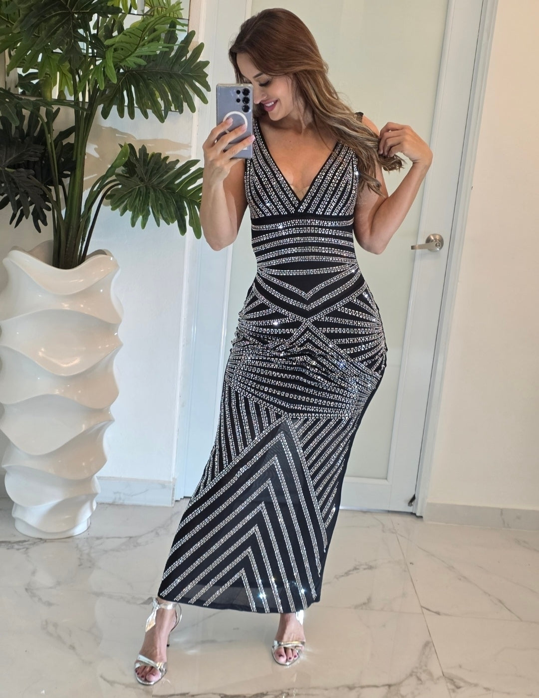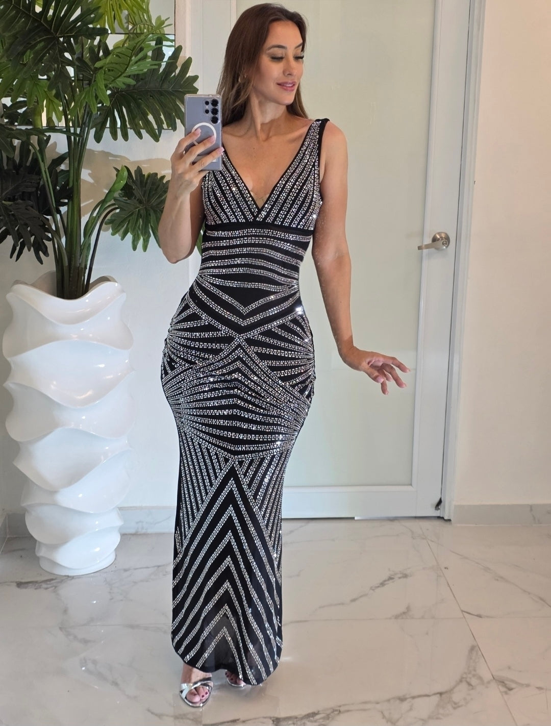 El escote en V aporta sofisticación sin exceso, mientras la estructura del diseño moldea la silueta con precisión y clase. Cada destello refleja exclusividad, presencia y refinamiento. No es tendencia: es atemporal. No es común: es pieza de colección.