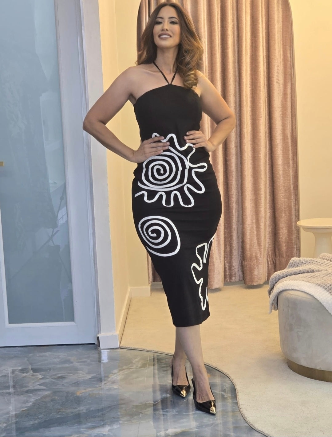 Turn heads in this stunning halter midi dress featuring bold abstract white designs on a sleek black silhouette. Perfect for nights out or art-inspired events.