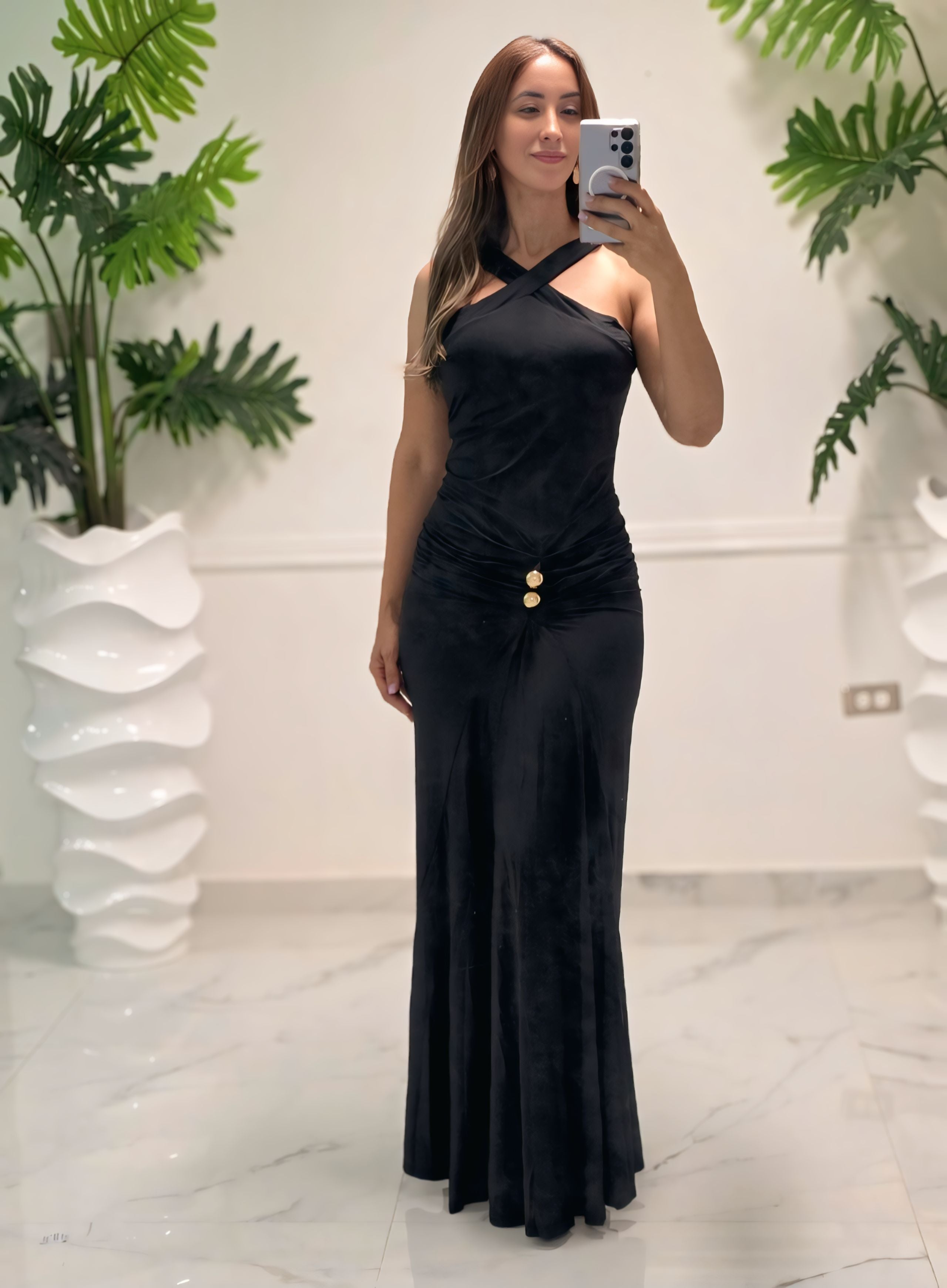 Un vestido que define sofisticación. Midnight Siren Gown combina un hermoso escote cruzado que realza hombros y cuello, con una caída fluida que estiliza la figura de manera impecable. El detalle de fruncido frontal con botones dorados añade un toque de lujo discreto y moderno.