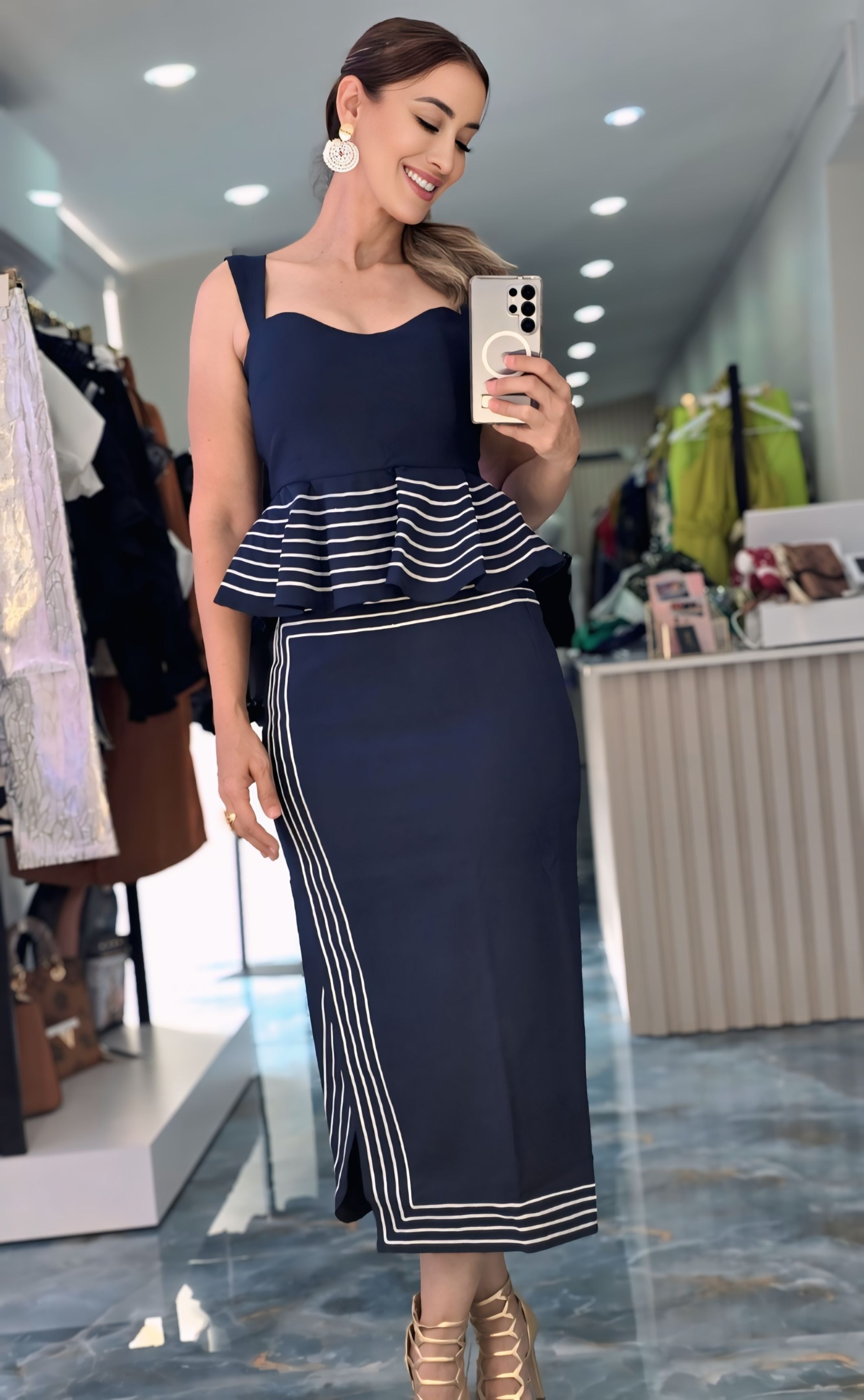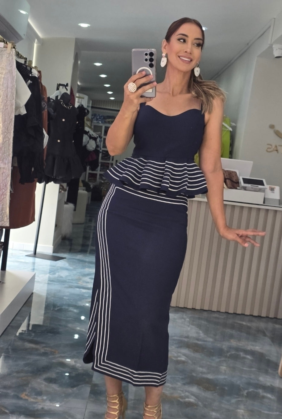 Elegancia y estructura en un solo conjunto. El Navy Chic Waves Set combina un top con volantes tipo peplum y falda midi con líneas en contraste que estilizan la silueta. Su corte clásico con un toque moderno lo hace ideal para eventos, cenas o reuniones donde quieras destacar con distinción. 💙👗 En Costas Boutique lo consigues😍🔥👌🥰