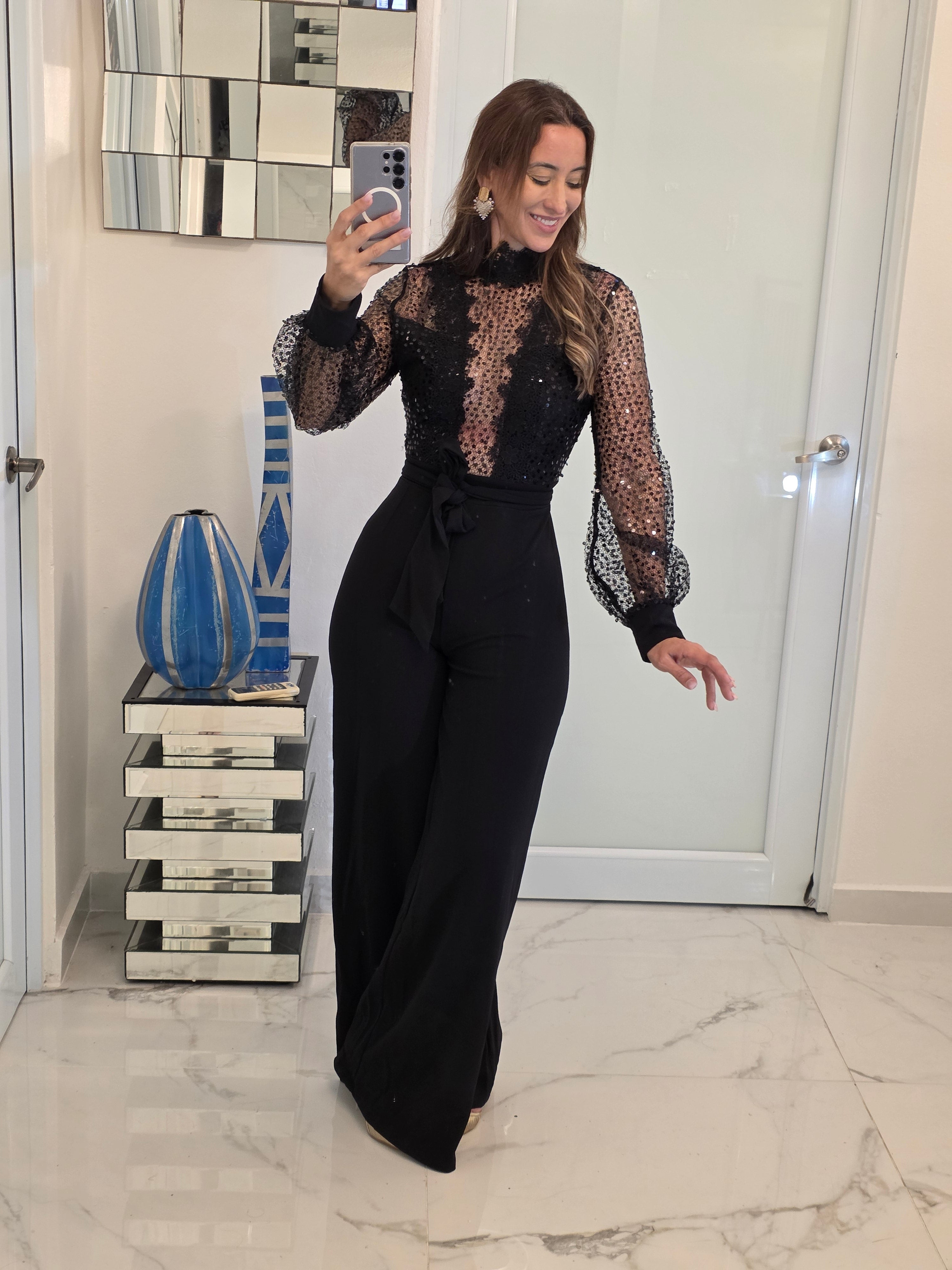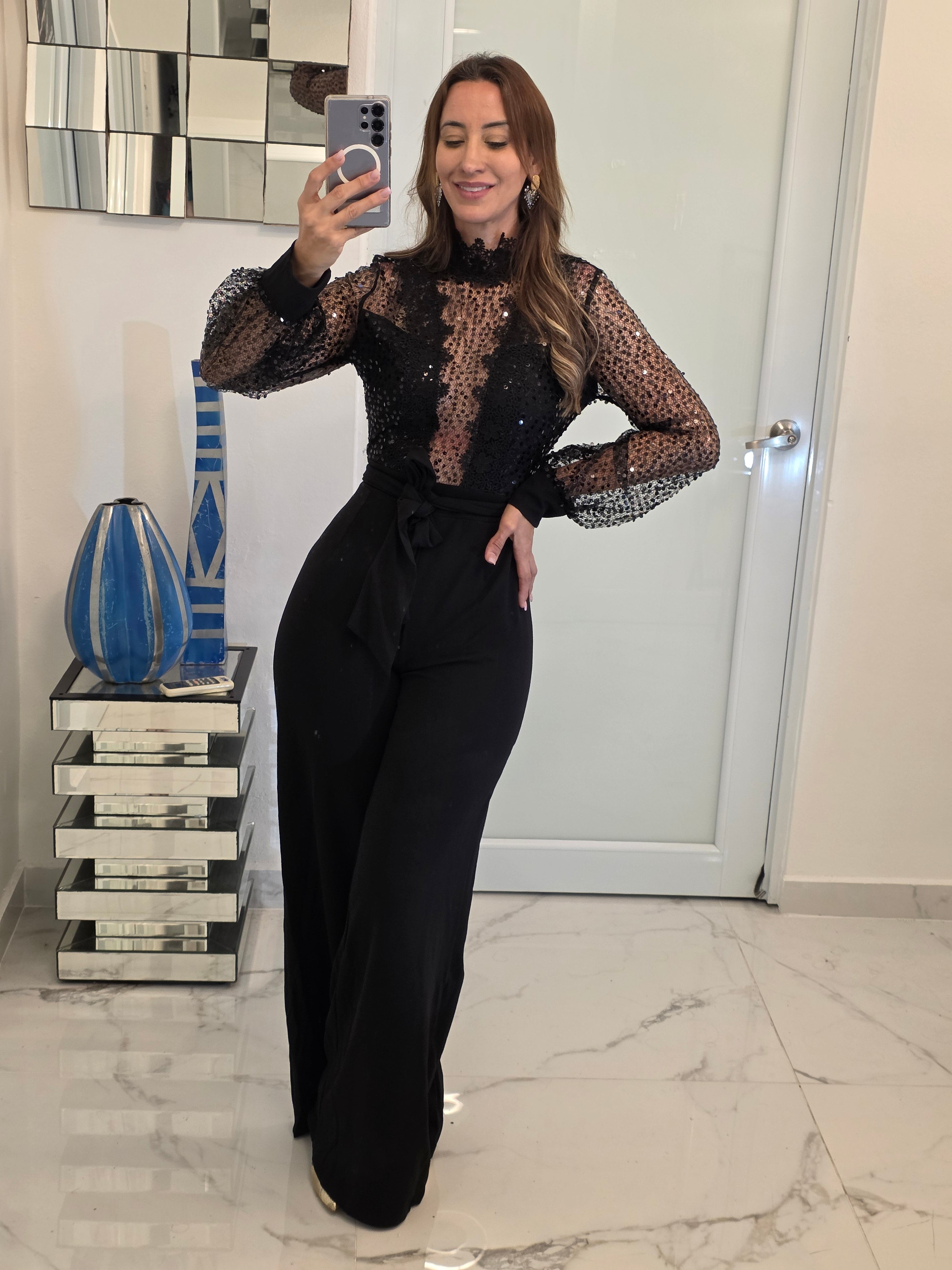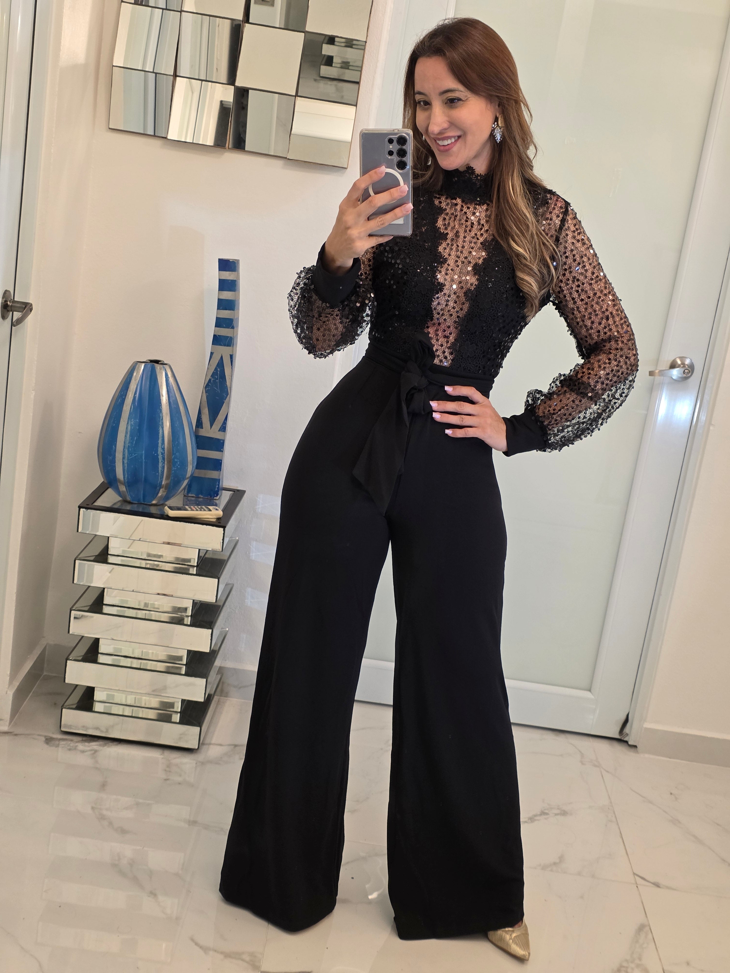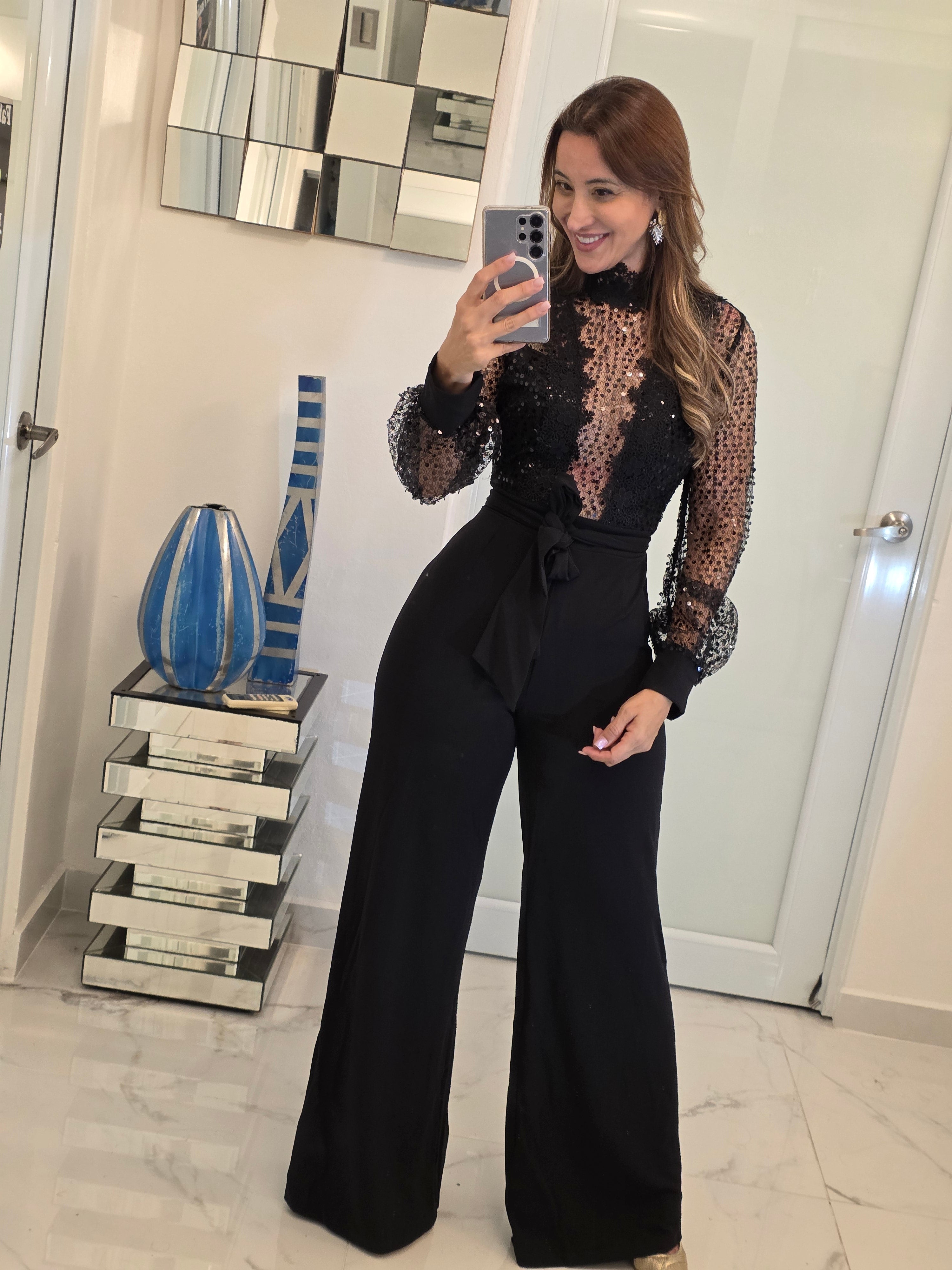 El contraste del negro profundo con el brillo sutil aporta un aire sensual y refinado, mientras el pantalón de pierna ancha y el lazo en cintura estilizan la silueta con perfección.