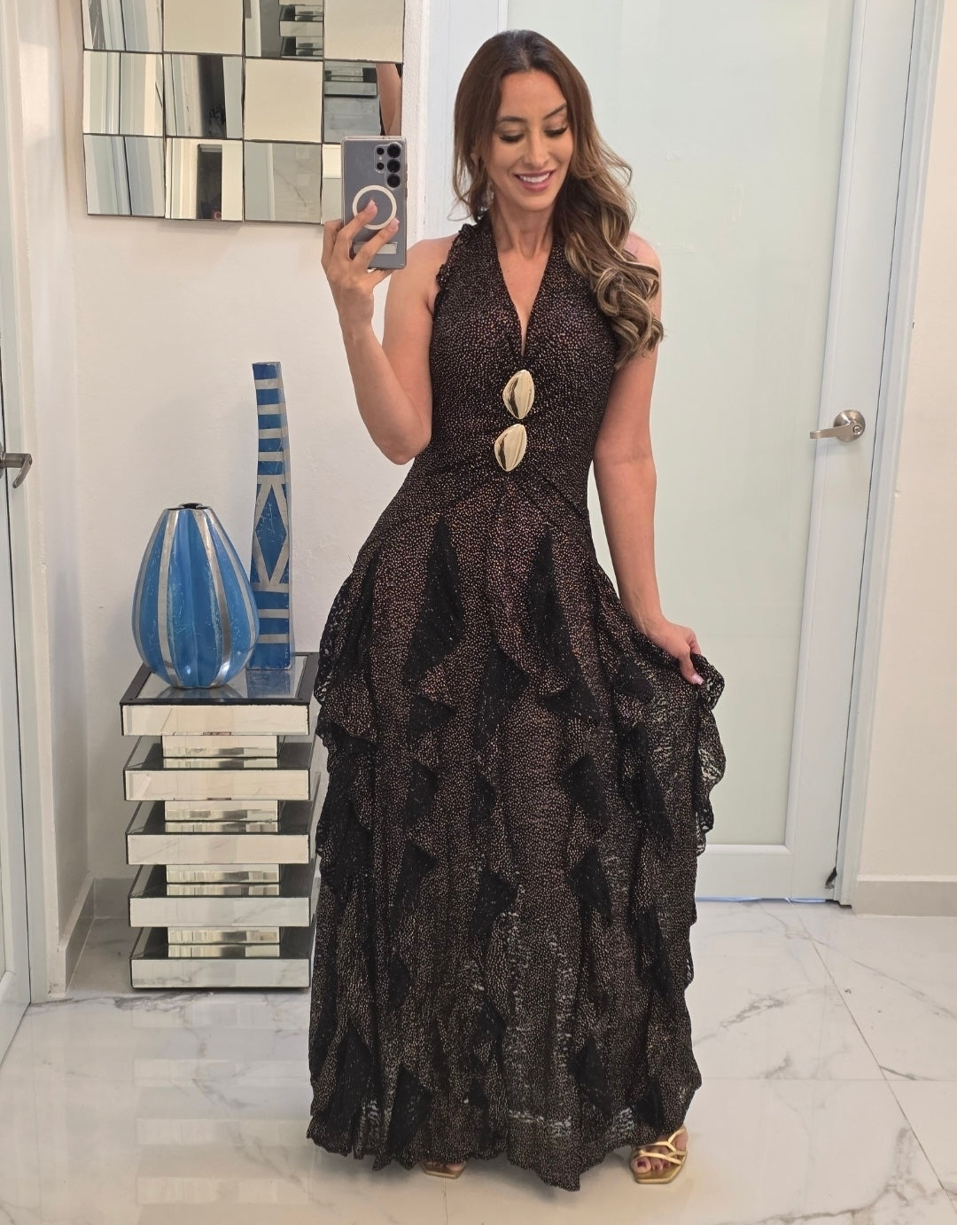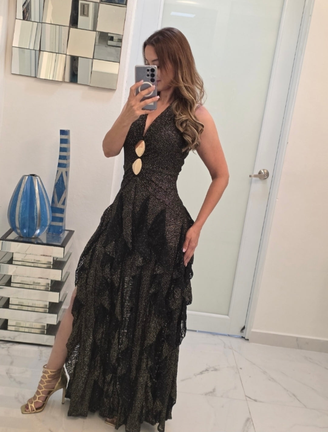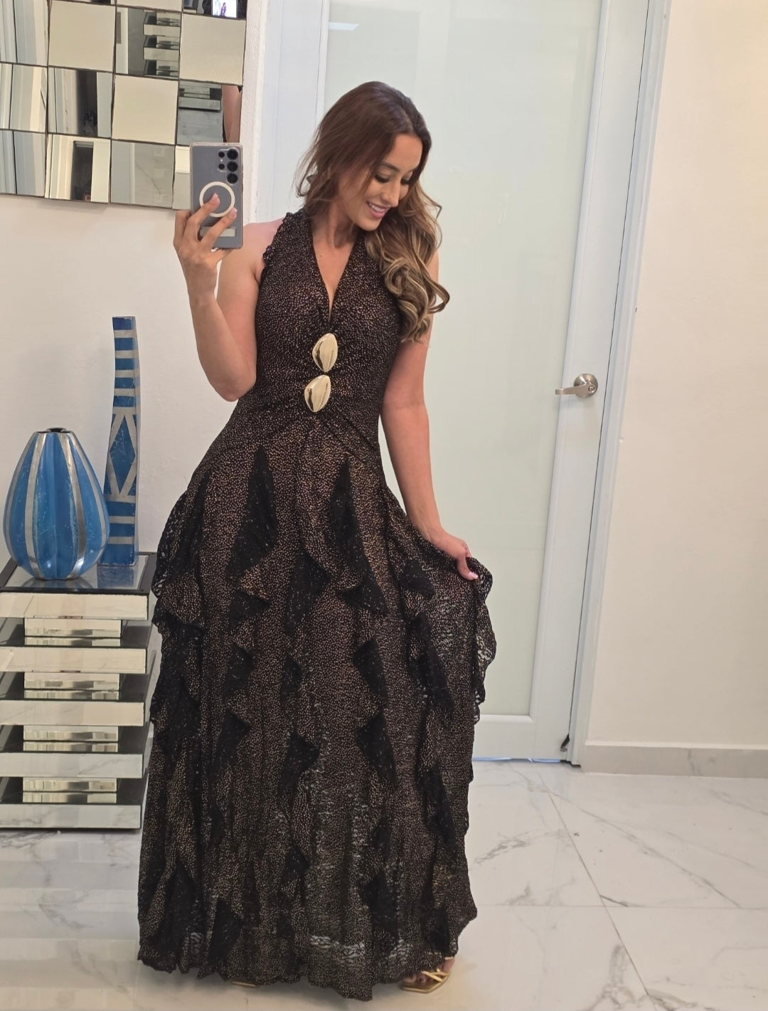 Su escote profundo se realza con dos placas decorativas en tono oro, que aportan un detalle moderno y lujoso al diseño. La falda fluida, de caída ligera y movimiento envolvente, estiliza la silueta y añade un toque etéreo que eleva cada paso.