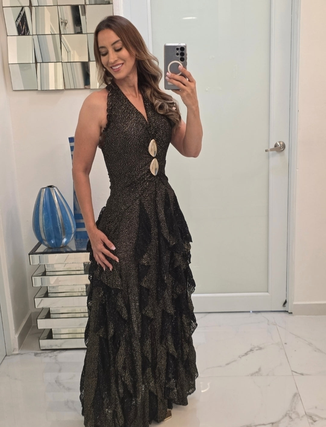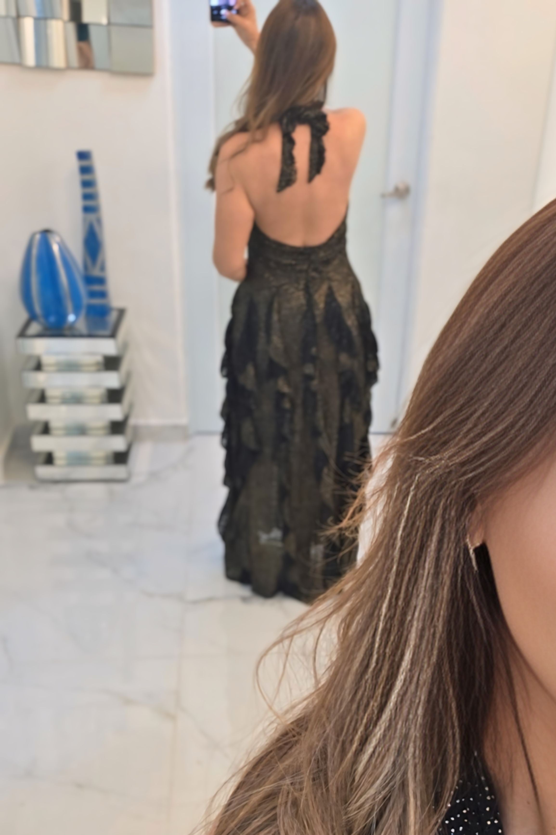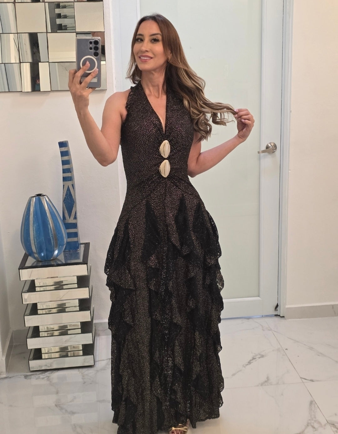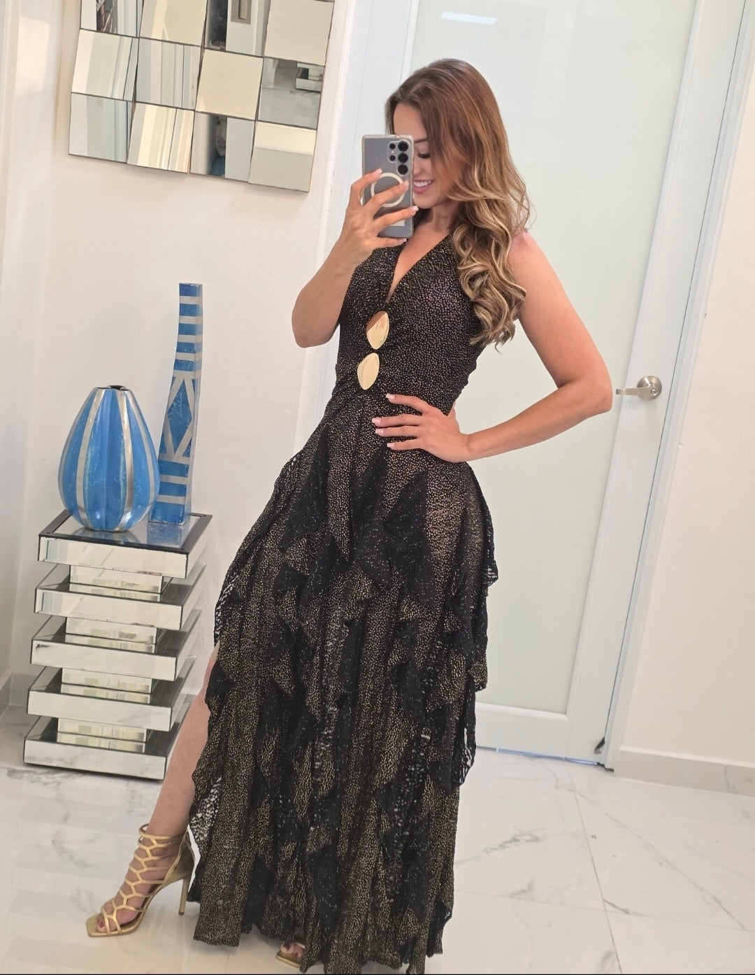 Su escote profundo se realza con dos placas decorativas en tono oro, que aportan un detalle moderno y lujoso al diseño. La falda fluida, de caída ligera y movimiento envolvente, estiliza la silueta y añade un toque etéreo que eleva cada paso.