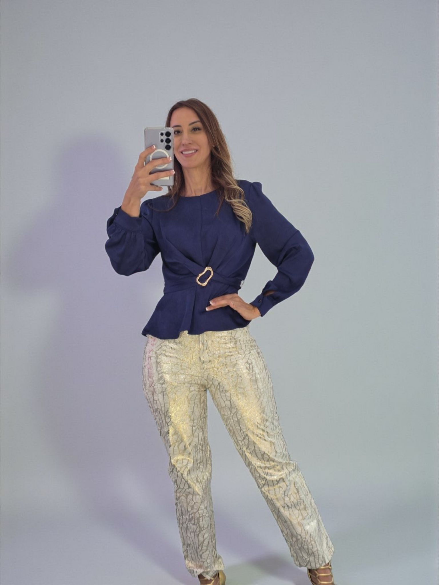 pantalón crema con brillo dorado y textura artística. Un look sofisticado, femenino y con presencia.