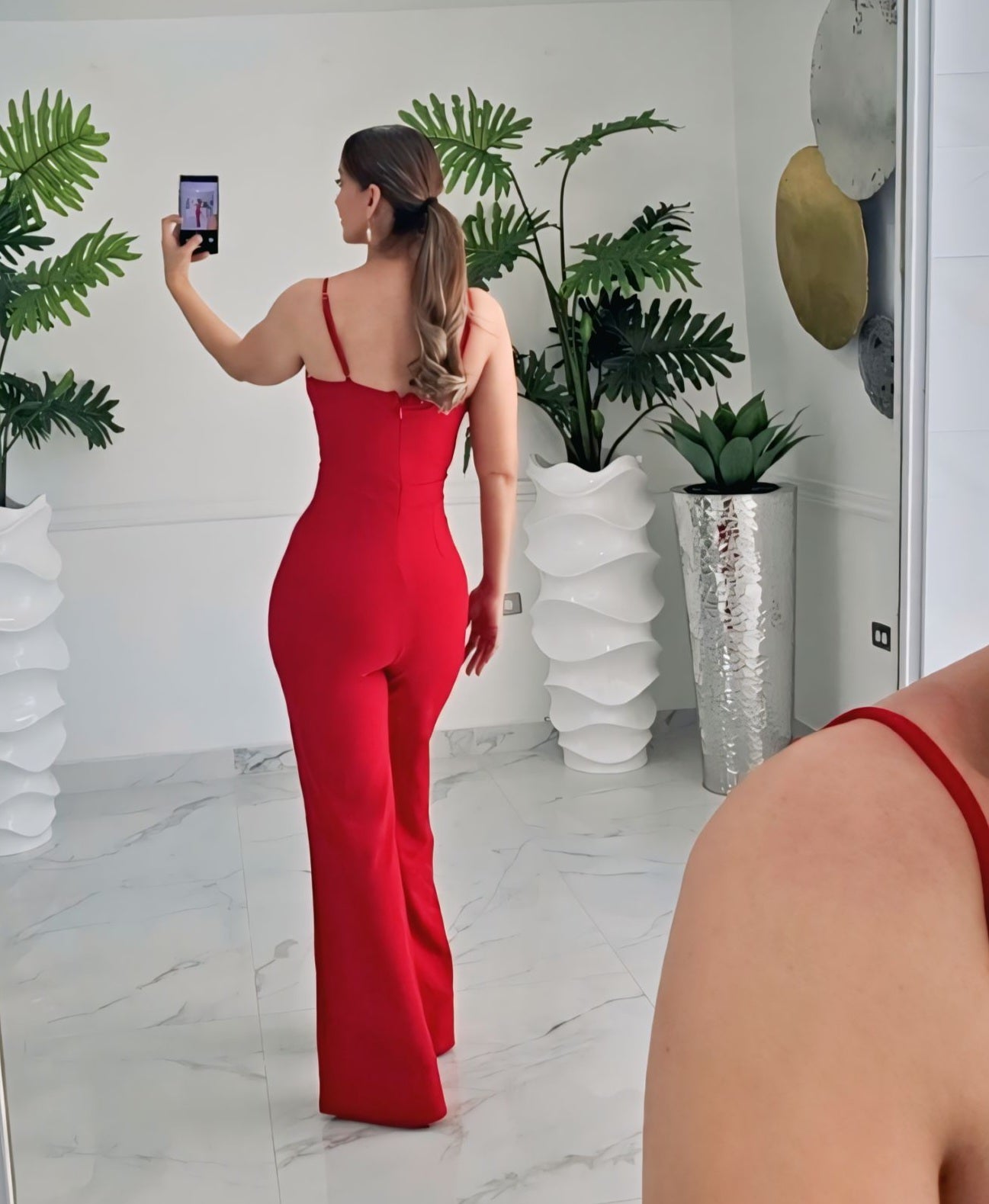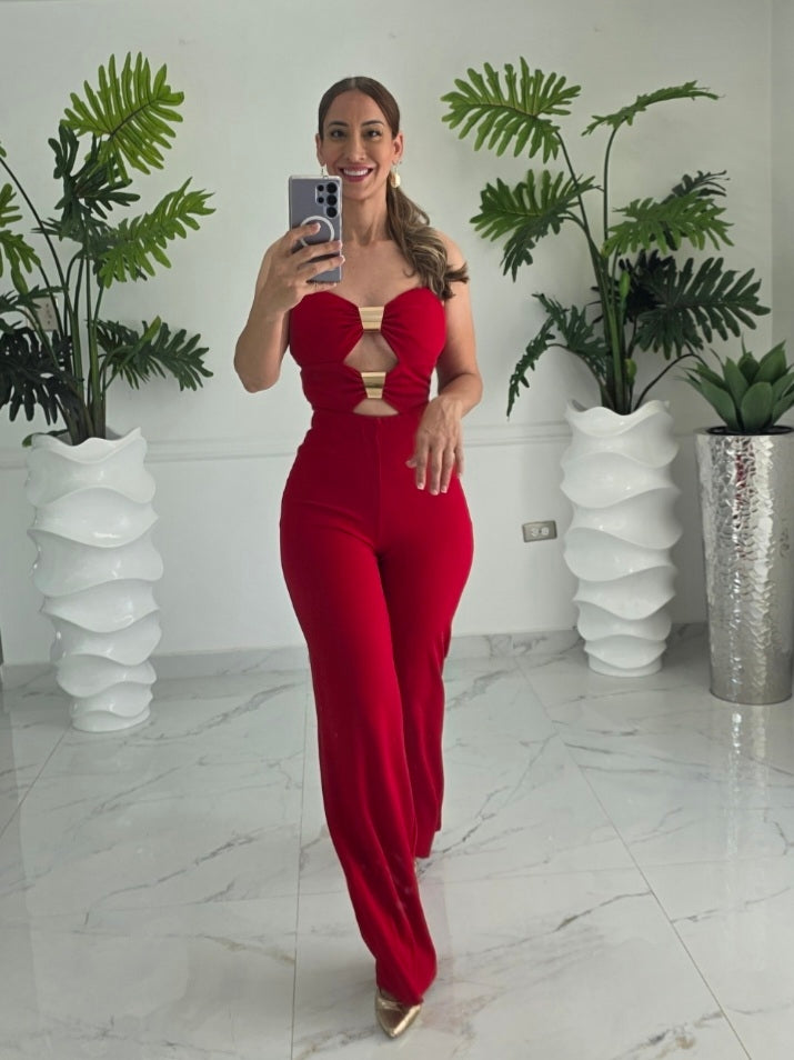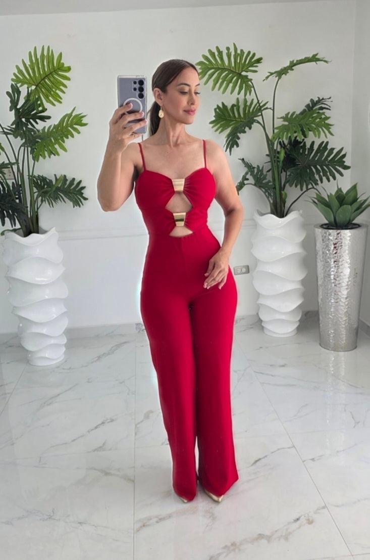 Un jumpsuit de corte largo y fluido en tono rojo vibrante, con tirantes finos y diseño frontal tipo cut-out unido por delicados acentos dorados. Su silueta estiliza la figura con una caída limpia en pierna recta, creando un look sofisticado y moderno perfecto para eventos, cenas elegantes y ocasiones festivas.