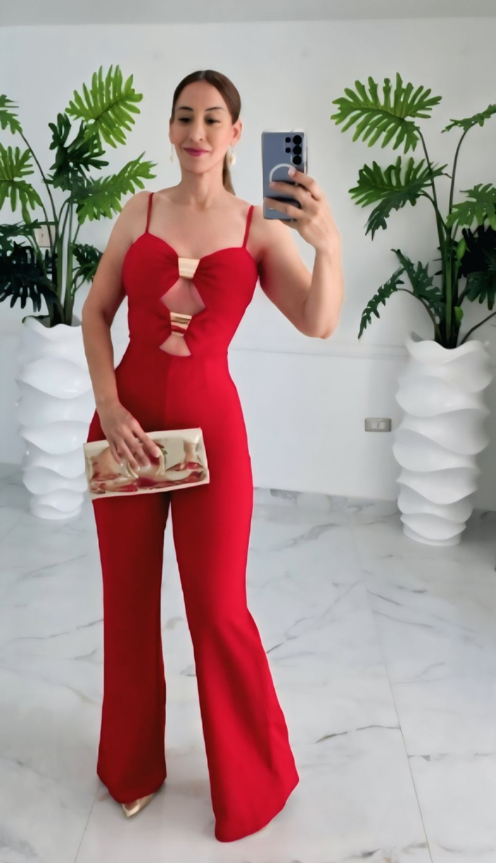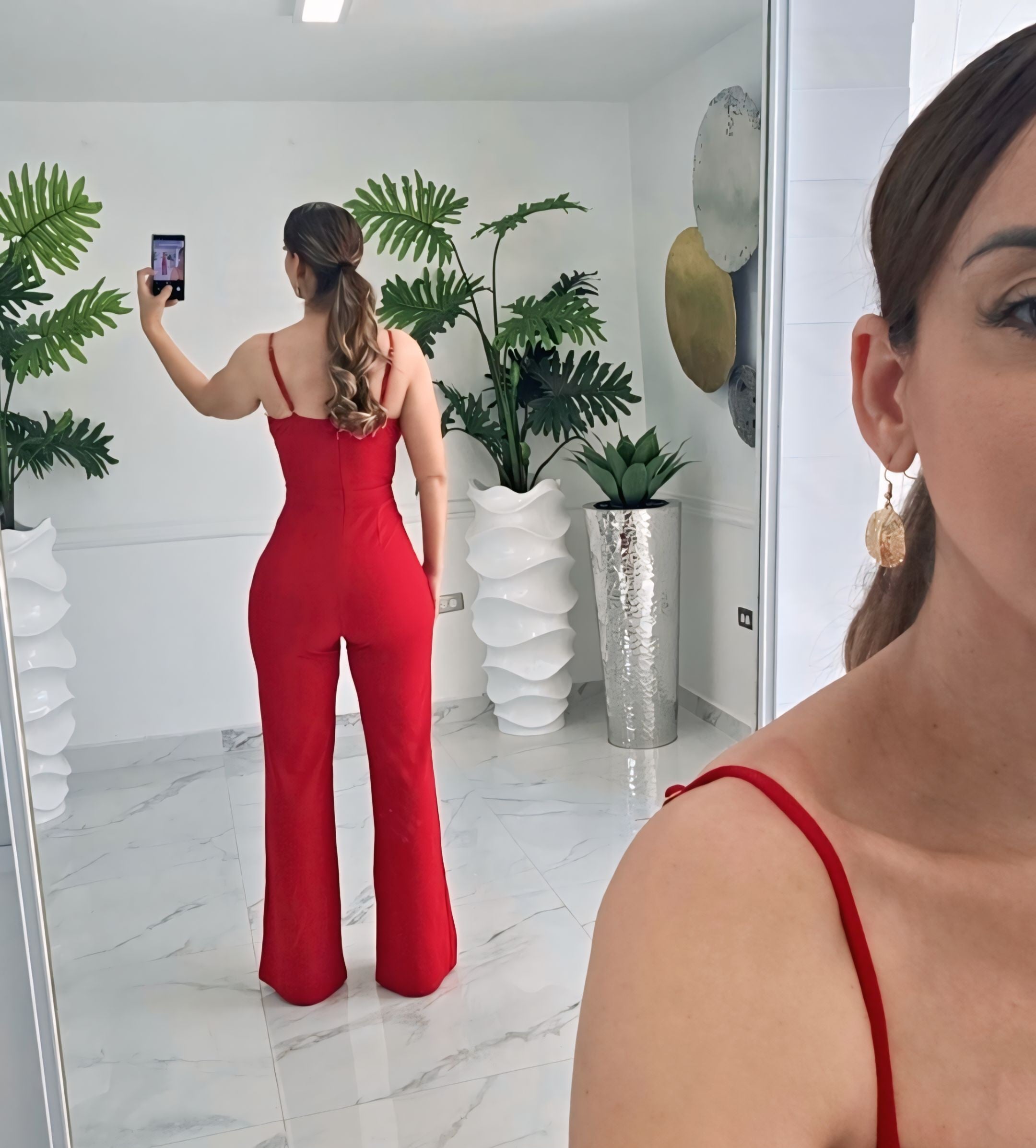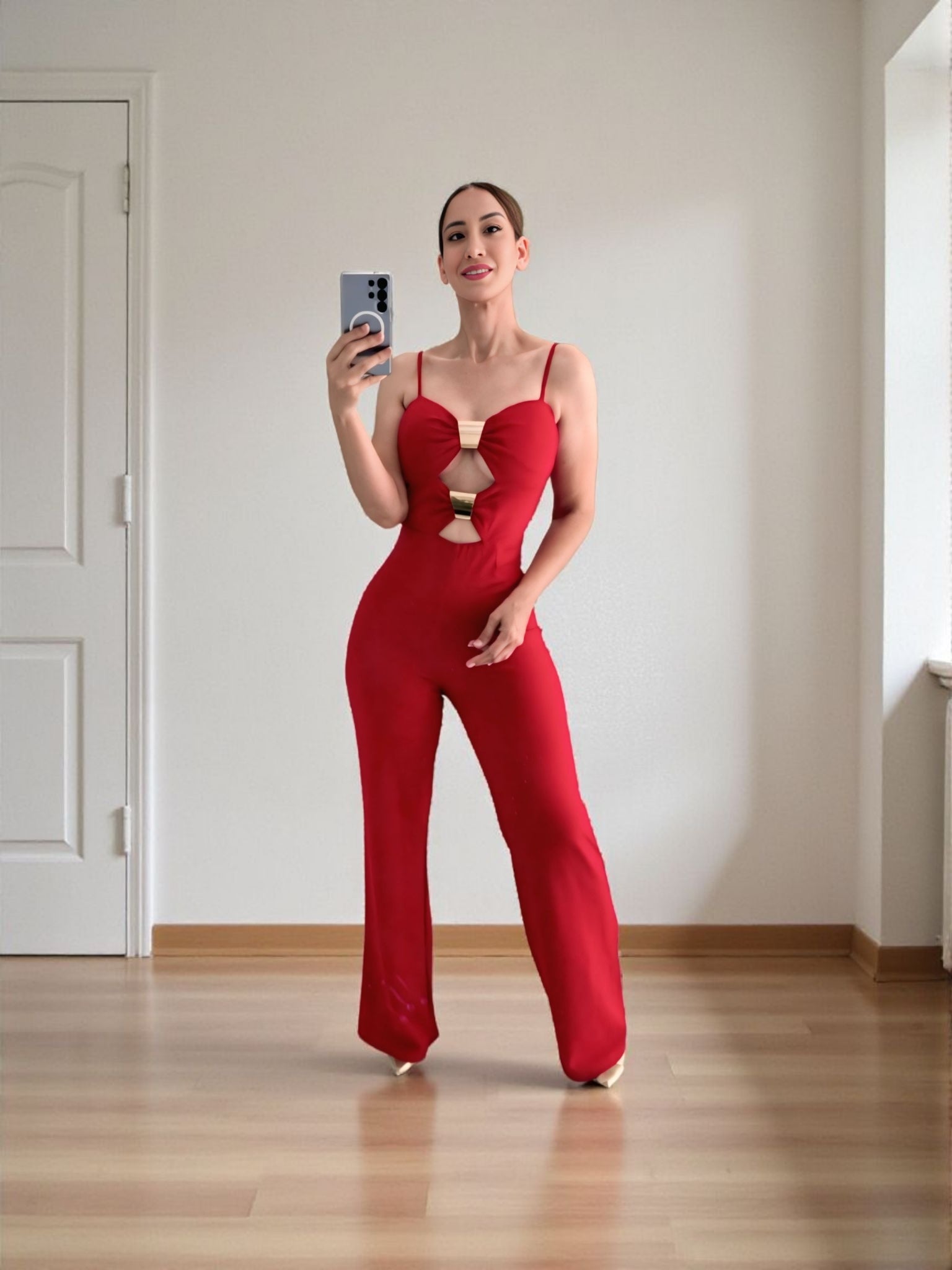 Un jumpsuit de corte largo y fluido en tono rojo vibrante, con tirantes finos y diseño frontal tipo cut-out unido por delicados acentos dorados. Su silueta estiliza la figura con una caída limpia en pierna recta, creando un look sofisticado y moderno perfecto para eventos, cenas elegantes y ocasiones festivas.