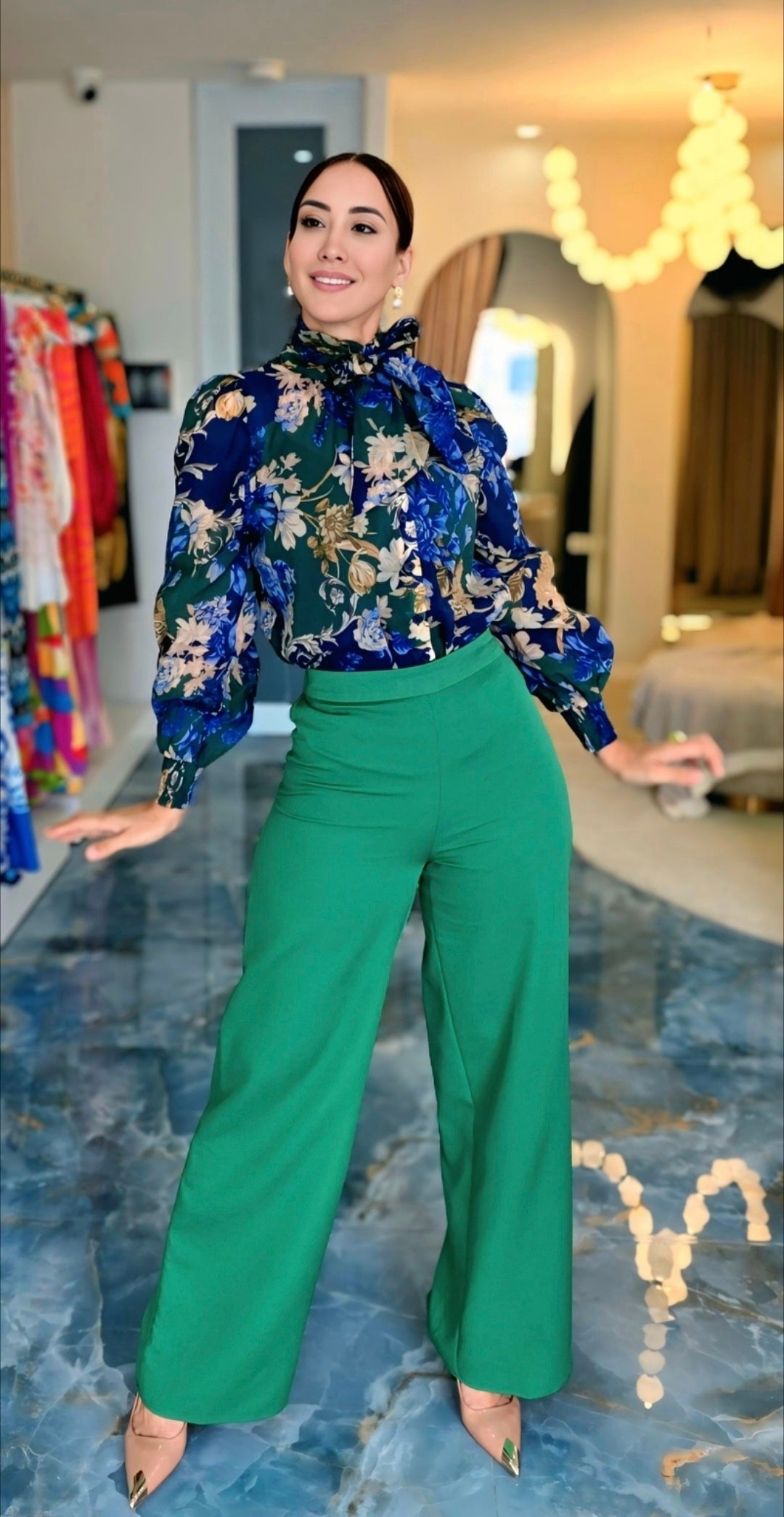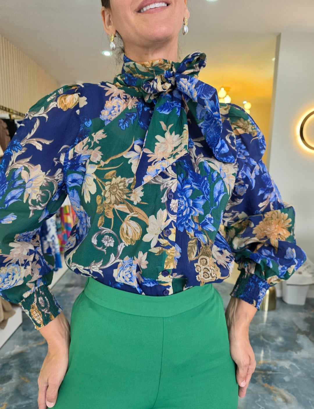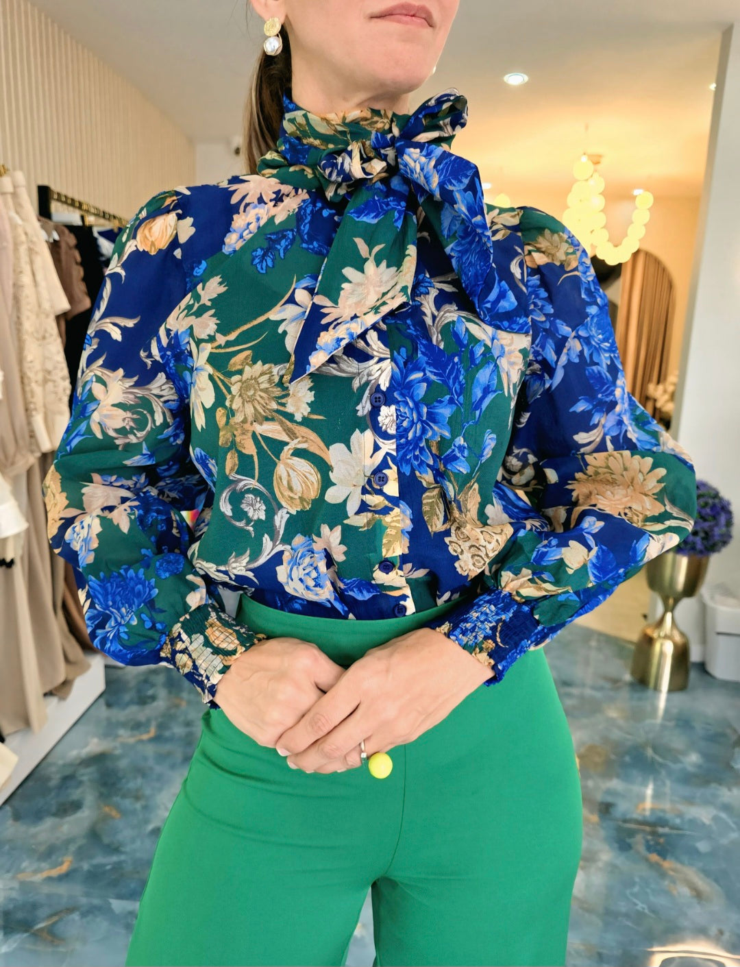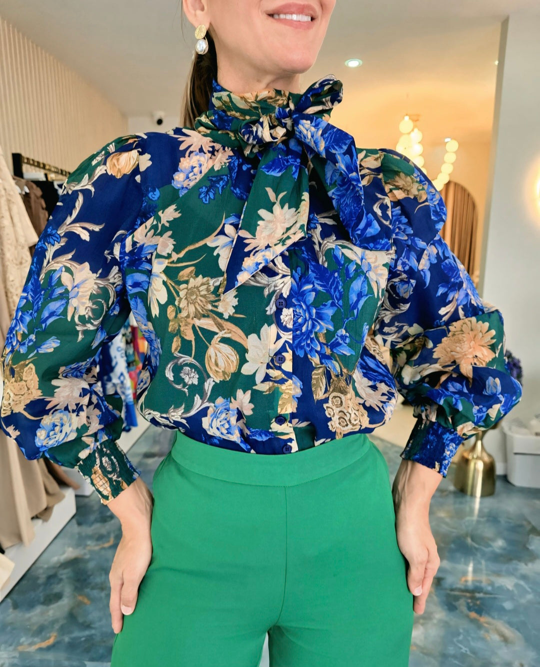 Esta blusa Royal Garden Bow combina la elegancia del azul royal con el encanto de los tonos verde esmeralda y dorado, creando un estampado floral de ensueño. Su lazo al cuello y mangas abullonadas añaden un aire sofisticado y femenino, ideal para destacar en reuniones o eventos especiales.