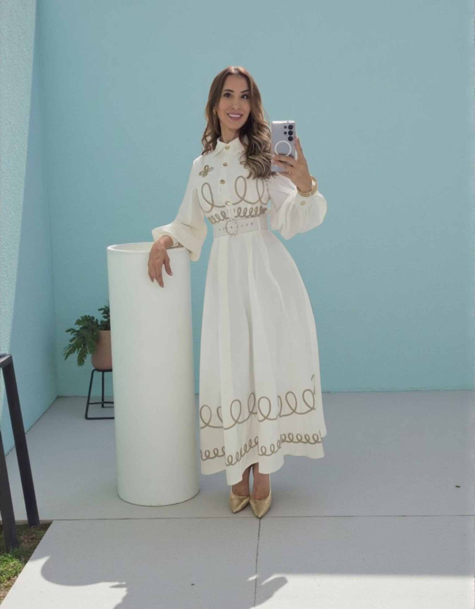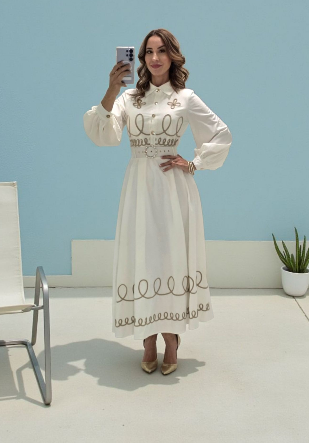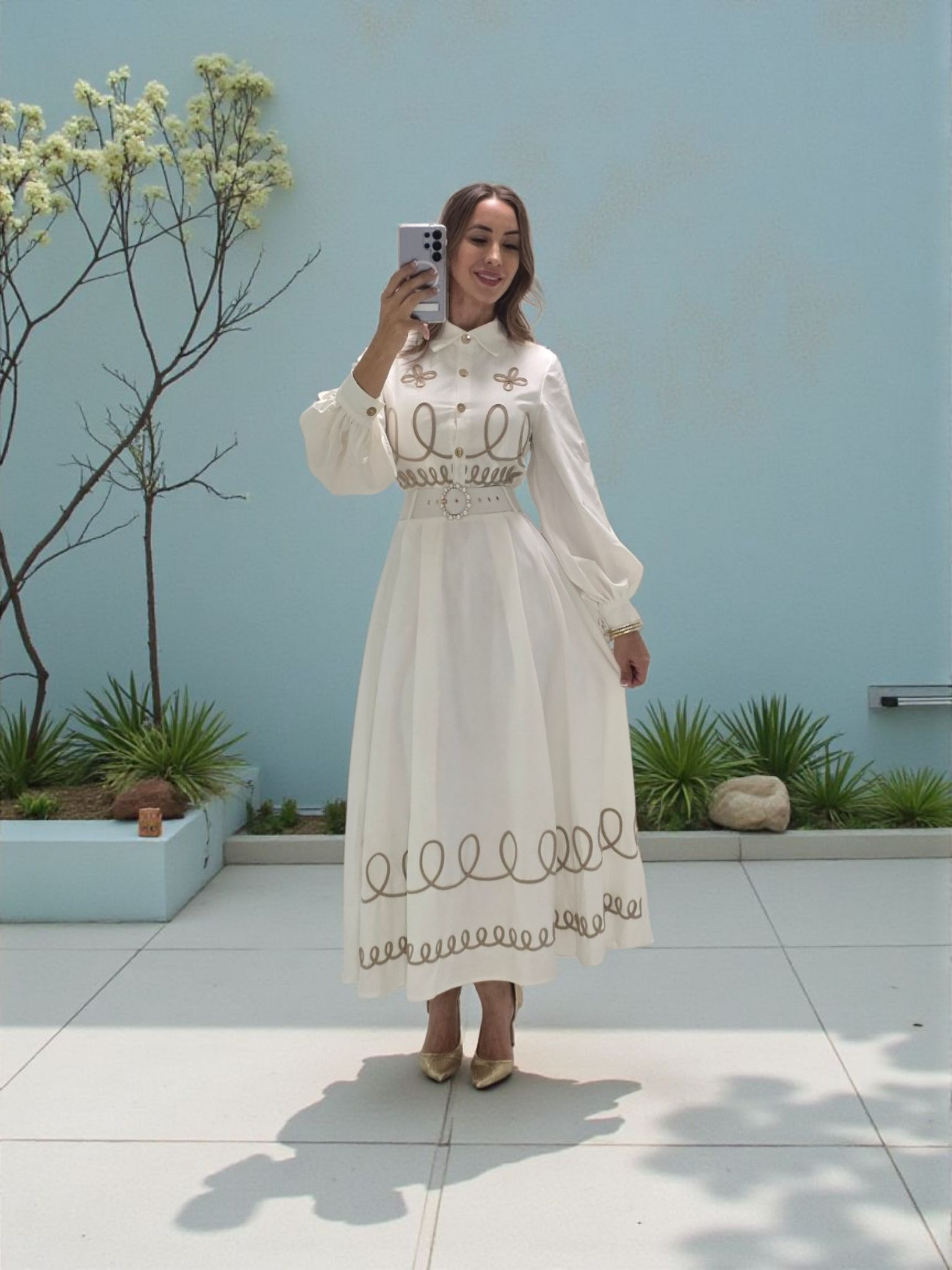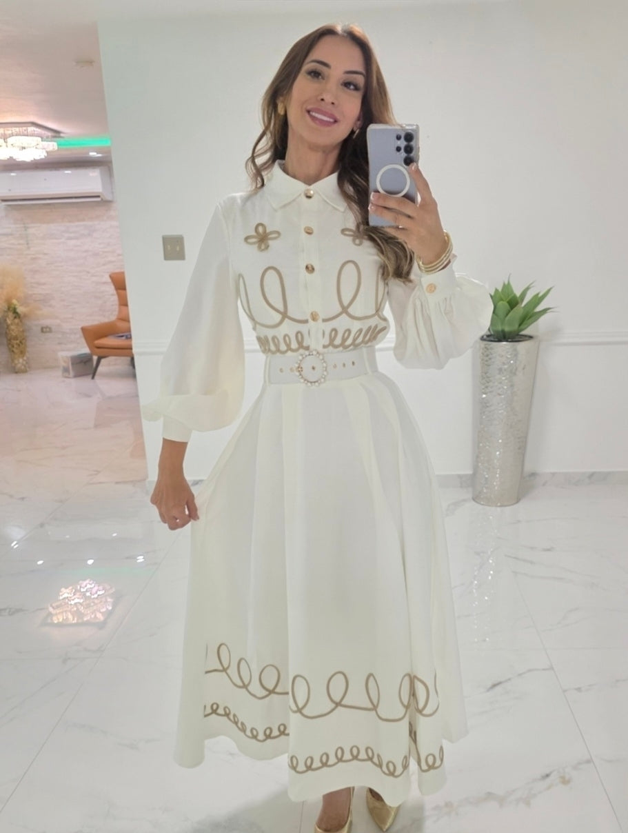 Royal Viena Midi Dress es la definición de elegancia clásica. Con botones dorados, mangas abullonadas y bordado delicado en tono beige, este vestido crea una silueta femenina y refinada. Incluye cinturón ajustable con detalle en hebilla para acentuar la cintura. Perfecto para eventos, brunch, iglesia o una ocasión especial donde quieras lucir impecable.