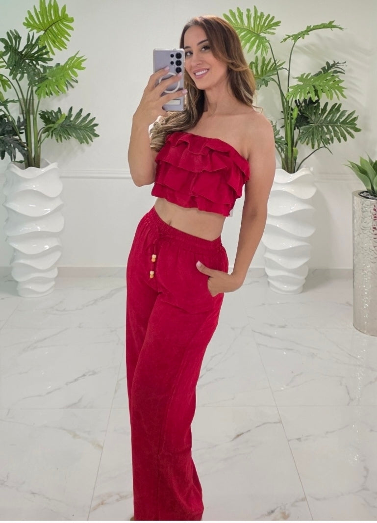 El Ruby Breeze Set es una combinación fresca, femenina y moderna que destaca por su color rojo intenso y su silueta relajada pero estilizada. Incluye un top tipo crop con delicados vuelos en capas que aportan movimiento y un toque romántico, junto a un pantalón de pierna ancha con cintura elástica que brinda comodidad sin perder elegancia.
