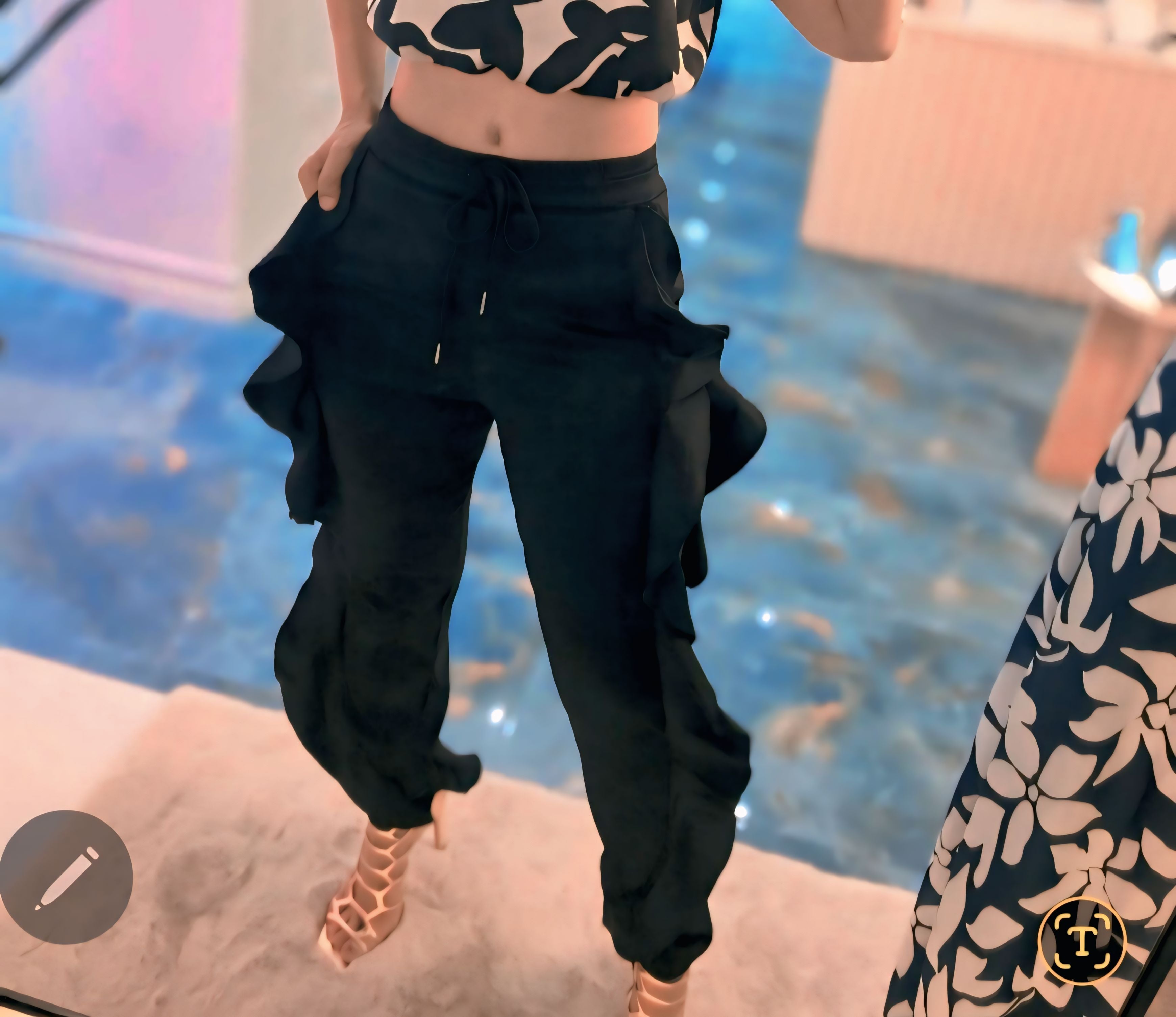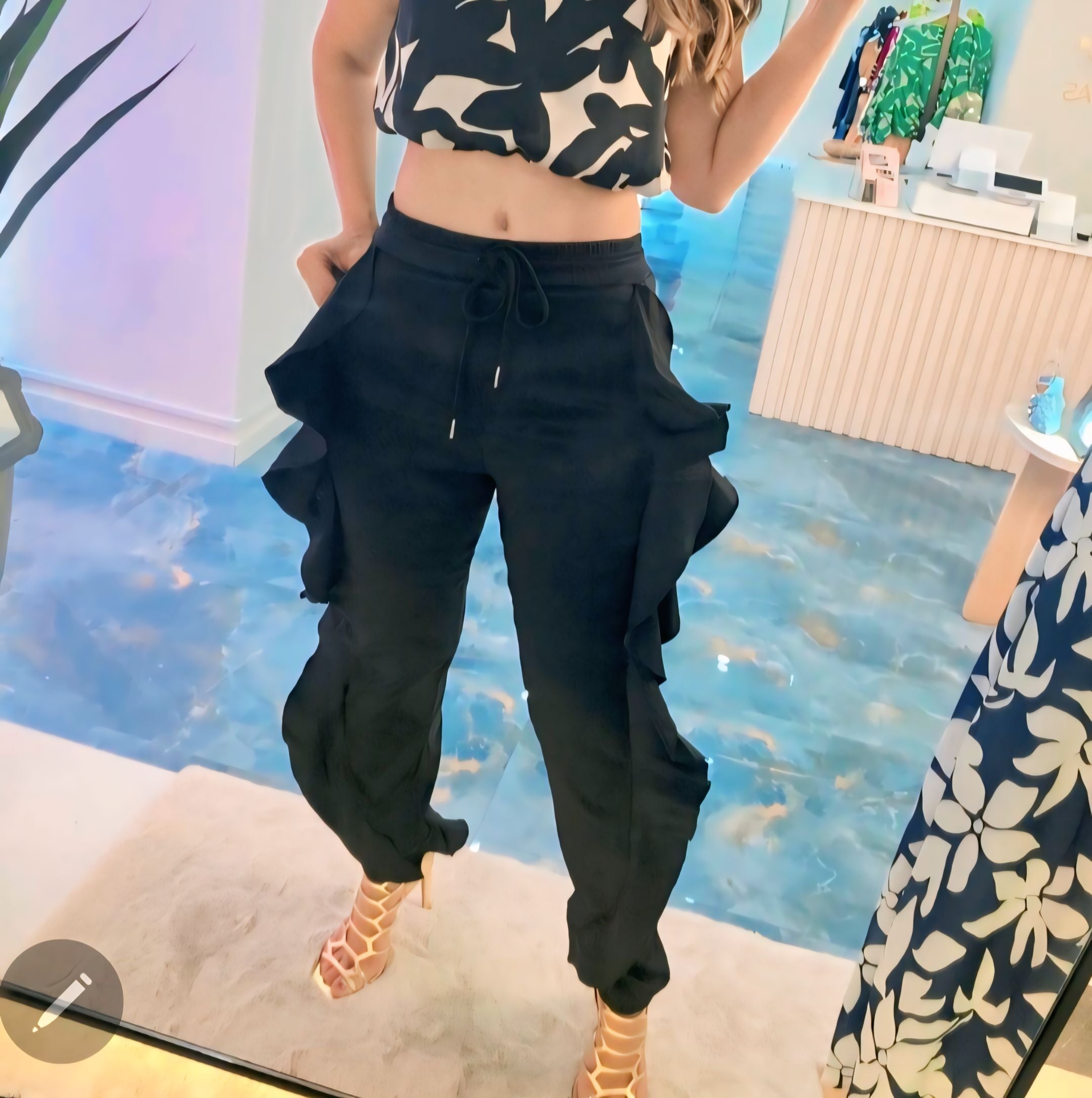 Este pantalón negro se distingue por sus volantes laterales en balance perfecto, creando un movimiento fluido y sofisticado en cada paso. Su estilo combina comodidad y elegancia con un toque artístico que resalta la figura sin esfuerzo.