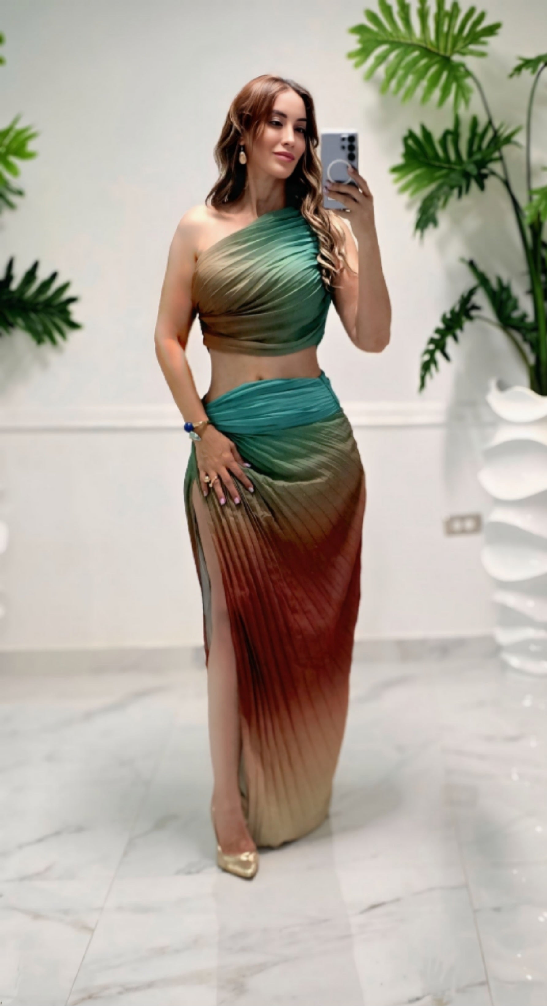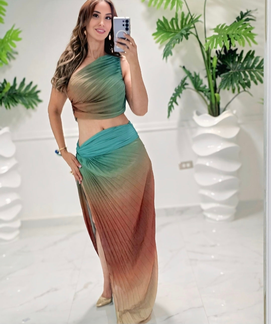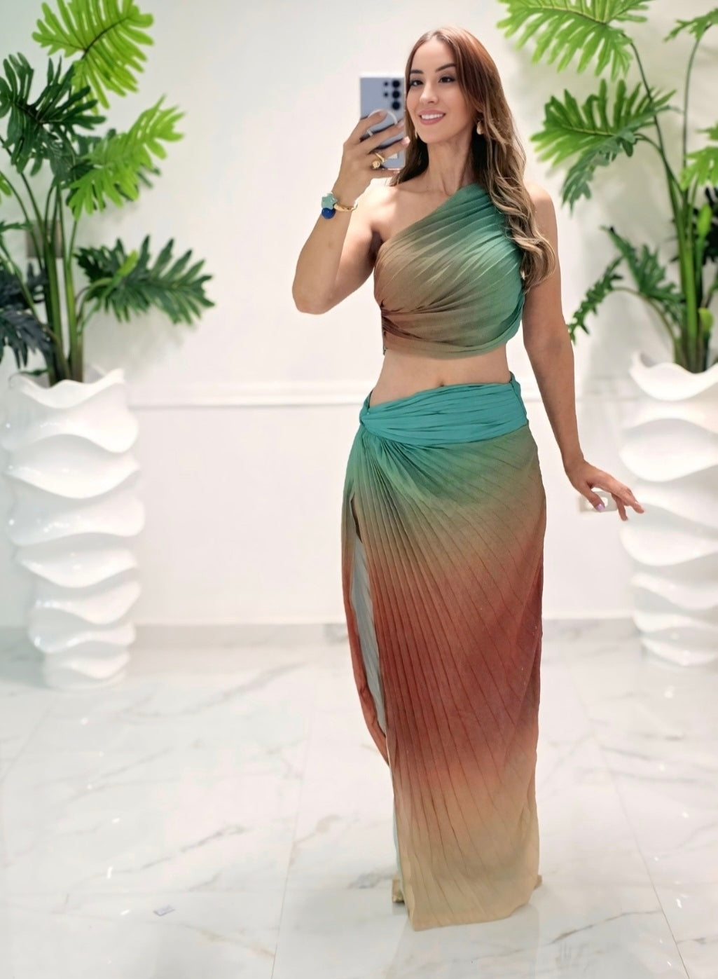 Este dos piezas destaca por su top asimétrico de un solo hombro, drapeado suavemente para estilizar la figura mientras aporta un toque artístico y moderno. La falda maxi, igualmente plisada, abraza la silueta con un efecto envolvente que acentúa la cintura y crea movimiento en cada paso.