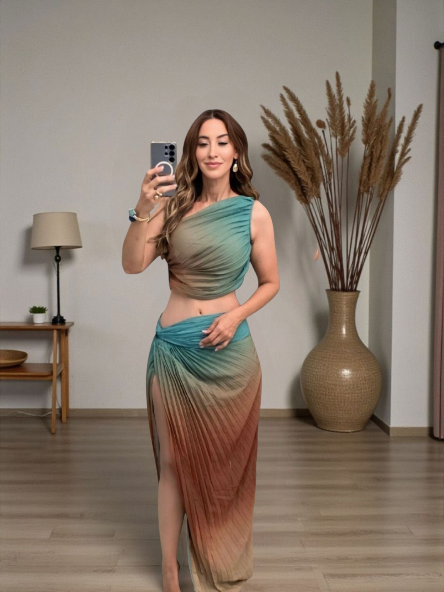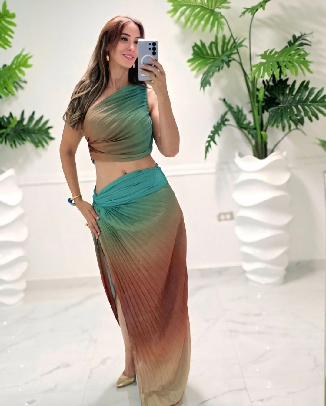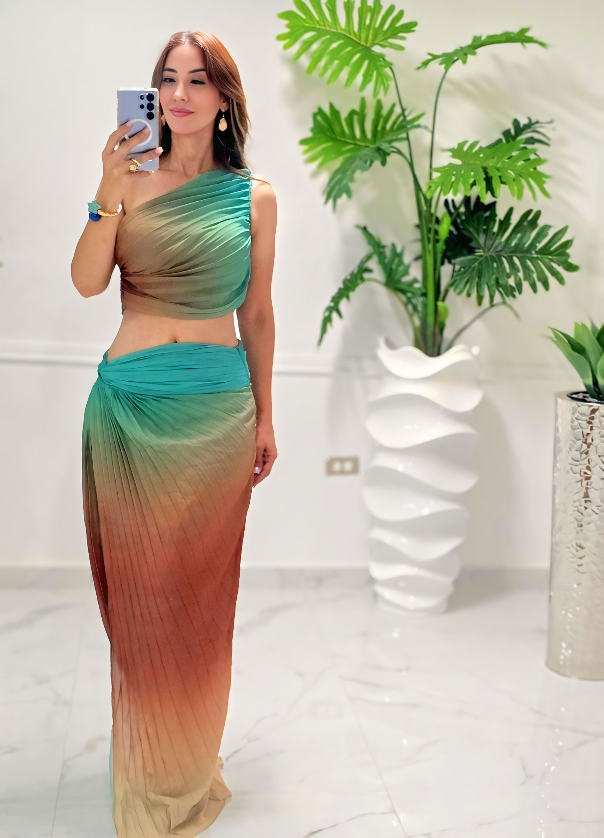 Este dos piezas destaca por su top asimétrico de un solo hombro, drapeado suavemente para estilizar la figura mientras aporta un toque artístico y moderno. La falda maxi, igualmente plisada, abraza la silueta con un efecto envolvente que acentúa la cintura y crea movimiento en cada paso.