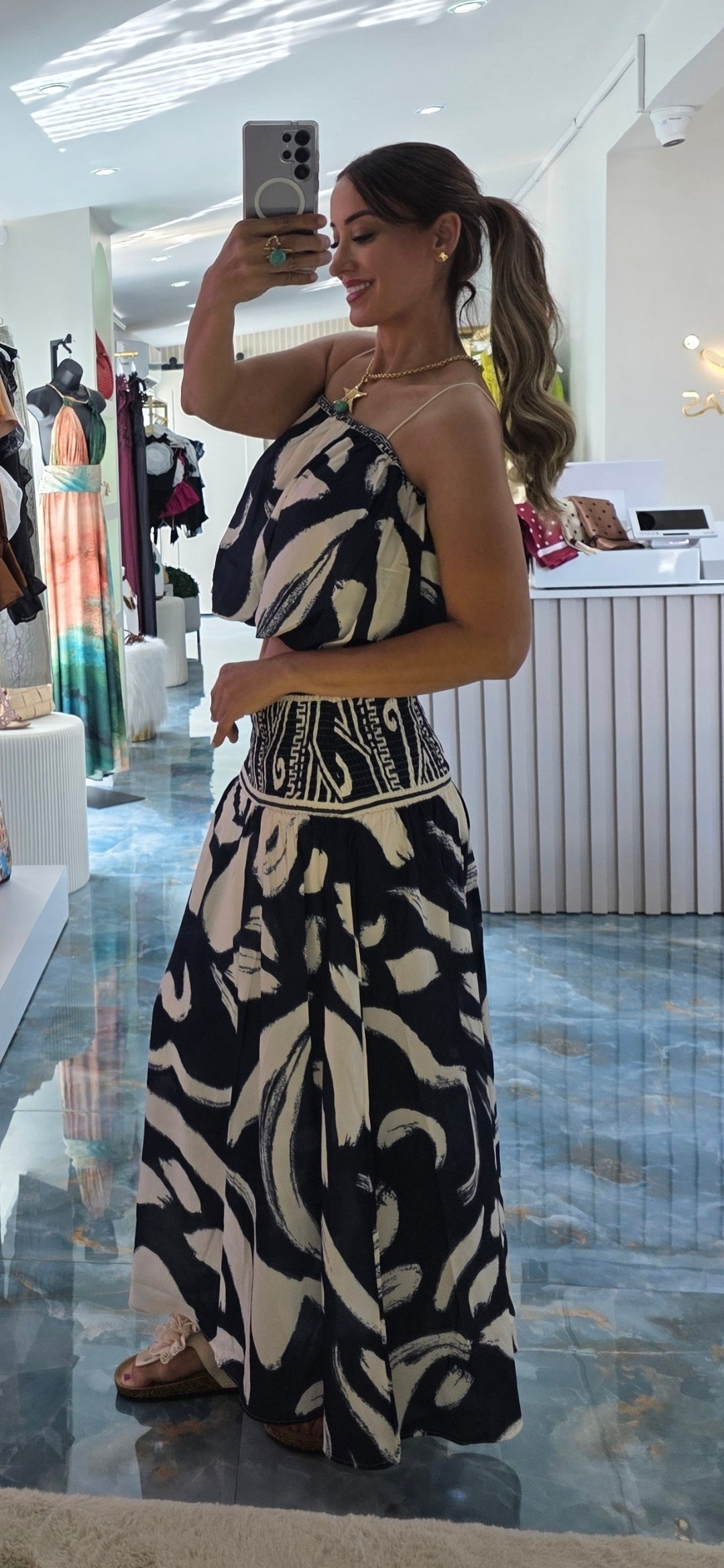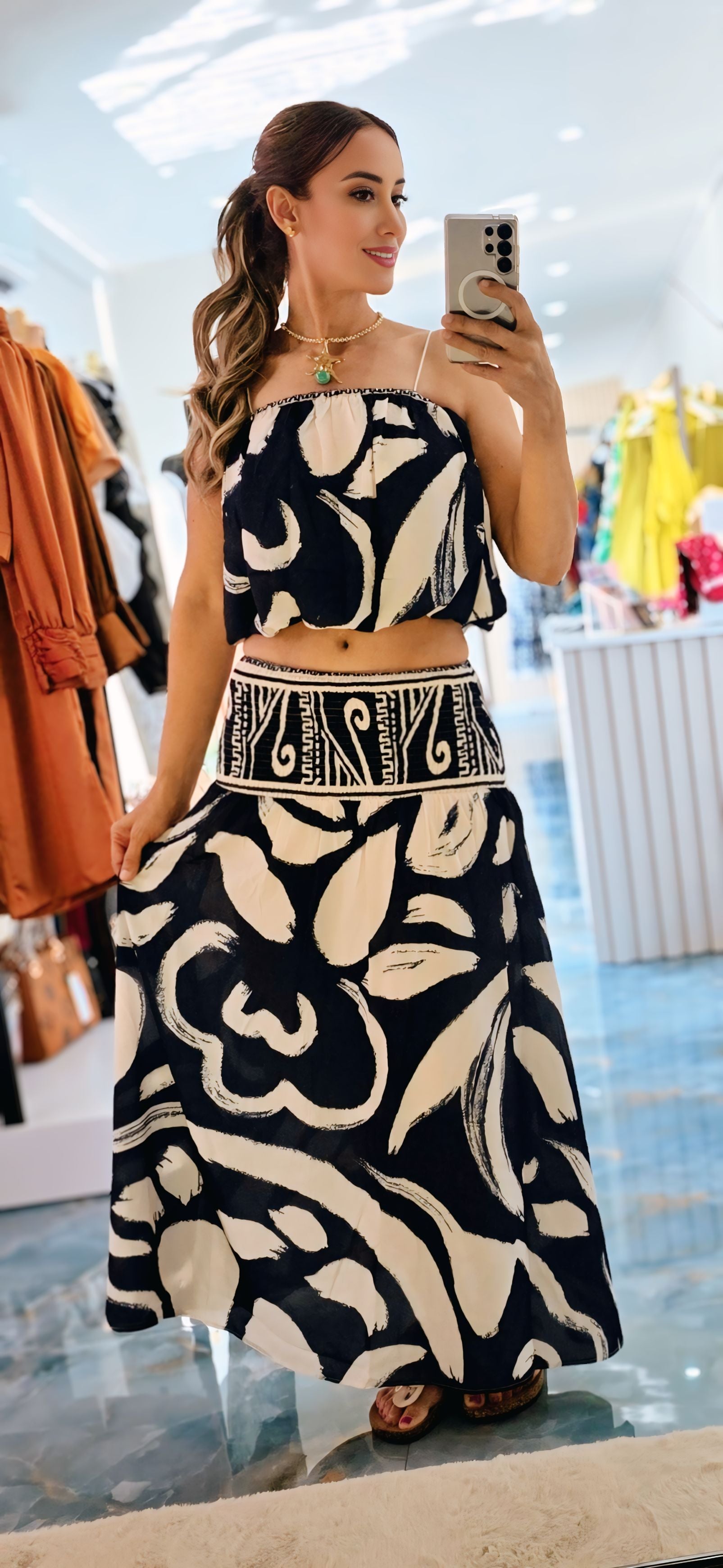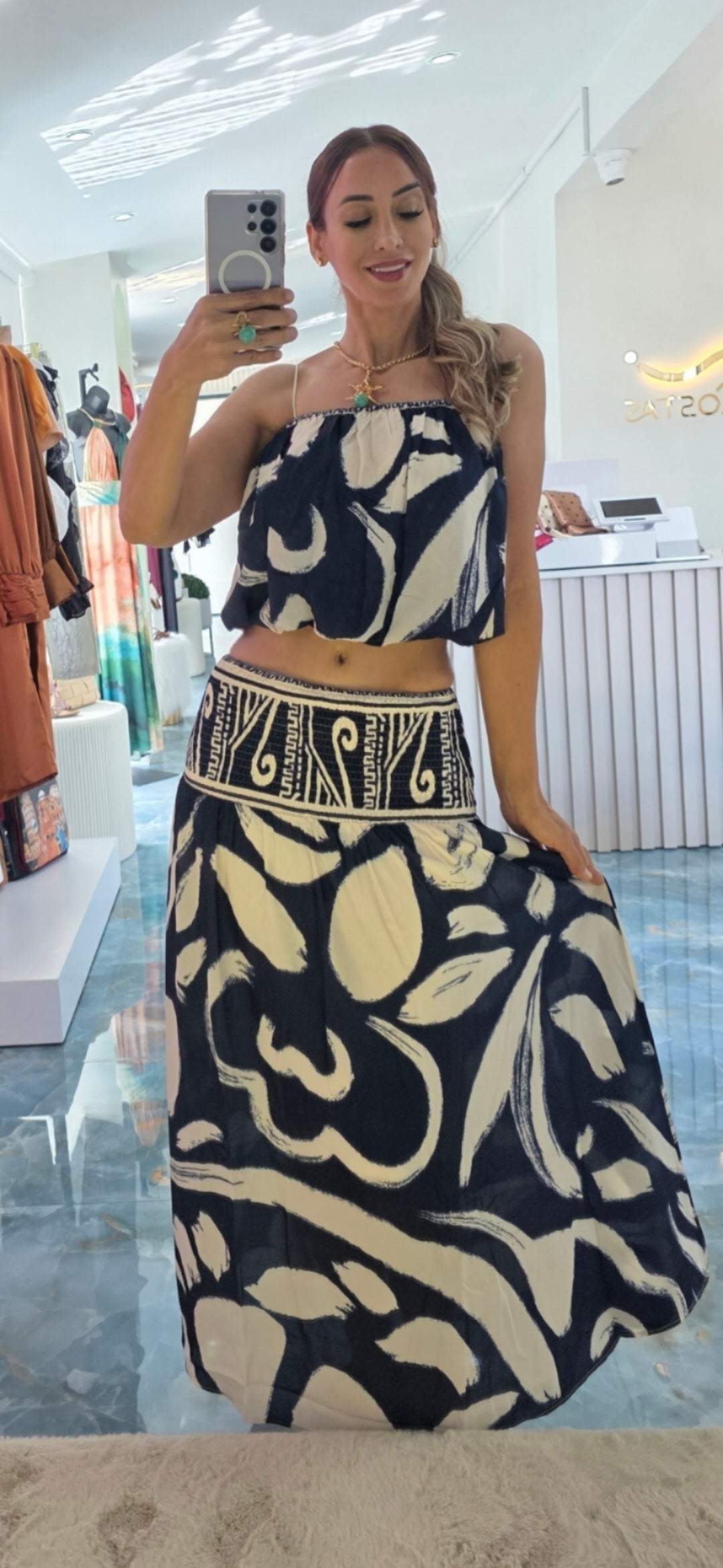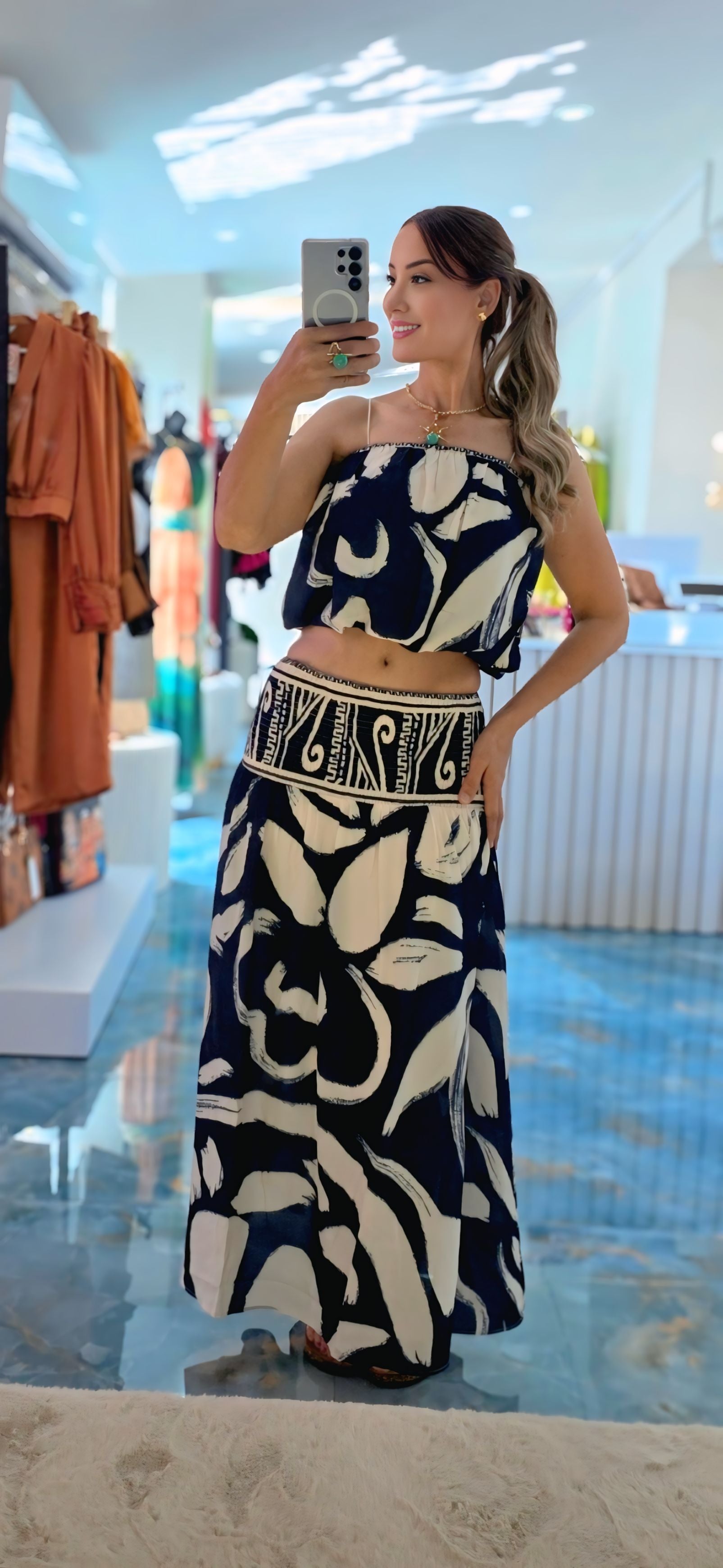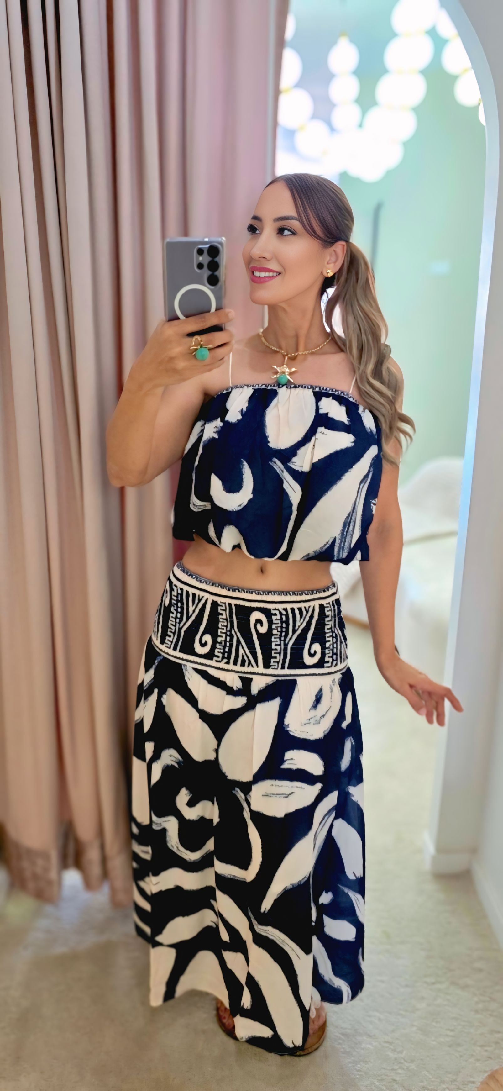 Un conjunto que evoca la frescura y elegancia del verano. Su estampado en tonos azul marino y crema refleja la belleza del océano con un aire artístico y moderno. El top de tirantes finos y caída fluida combina a la perfección con la falda amplia de cintura bordada, creando una silueta femenina, ligera y sofisticada. Ideal para una salida tropical, una cena junto al mar o un look chic de vacaciones. ✨