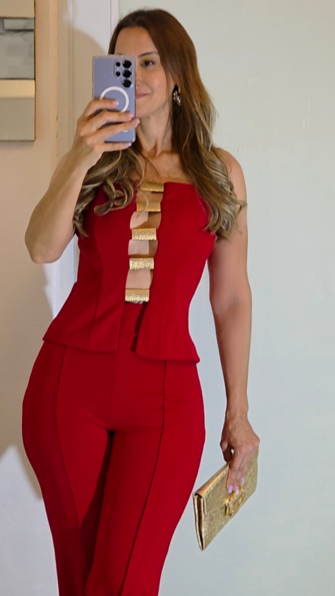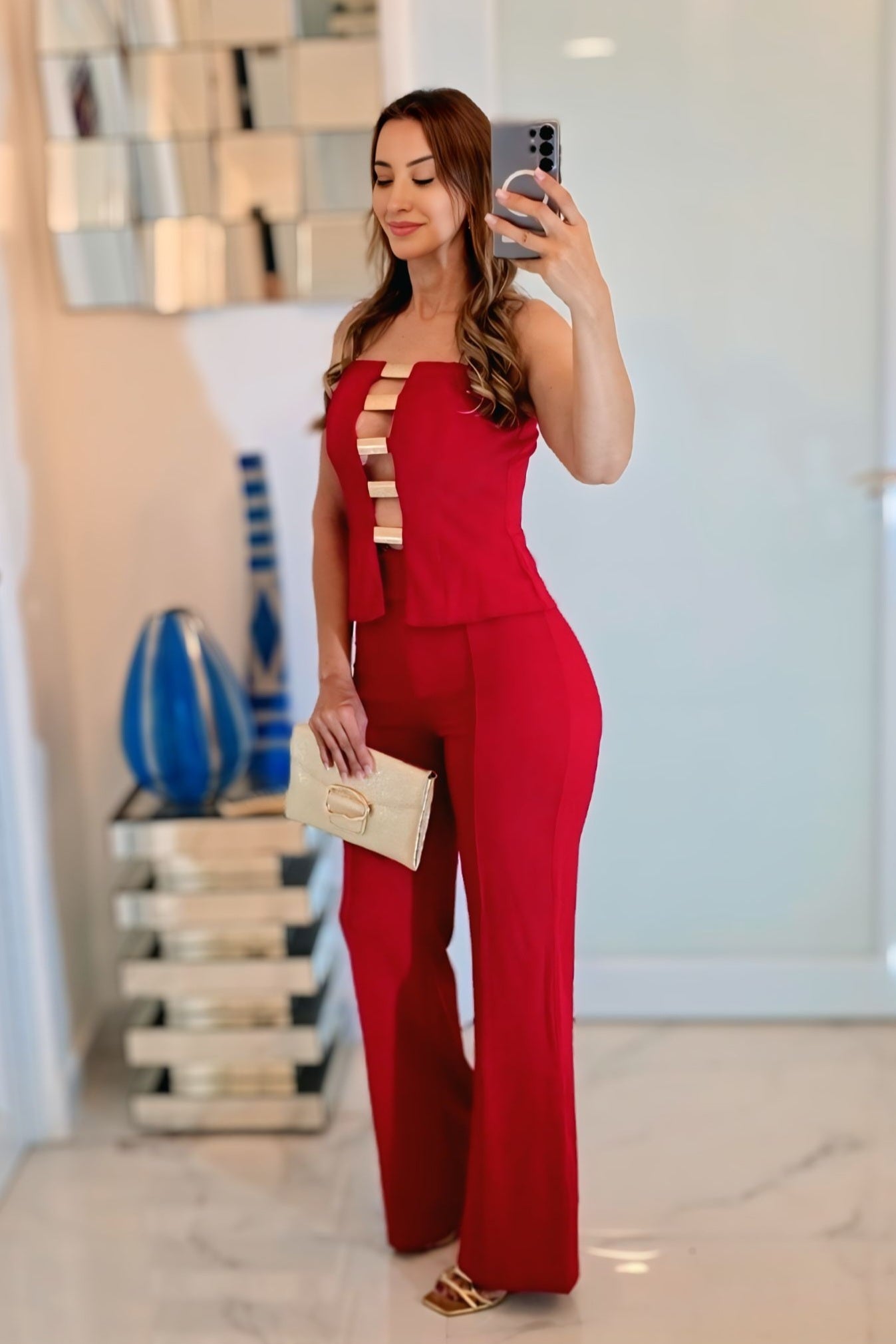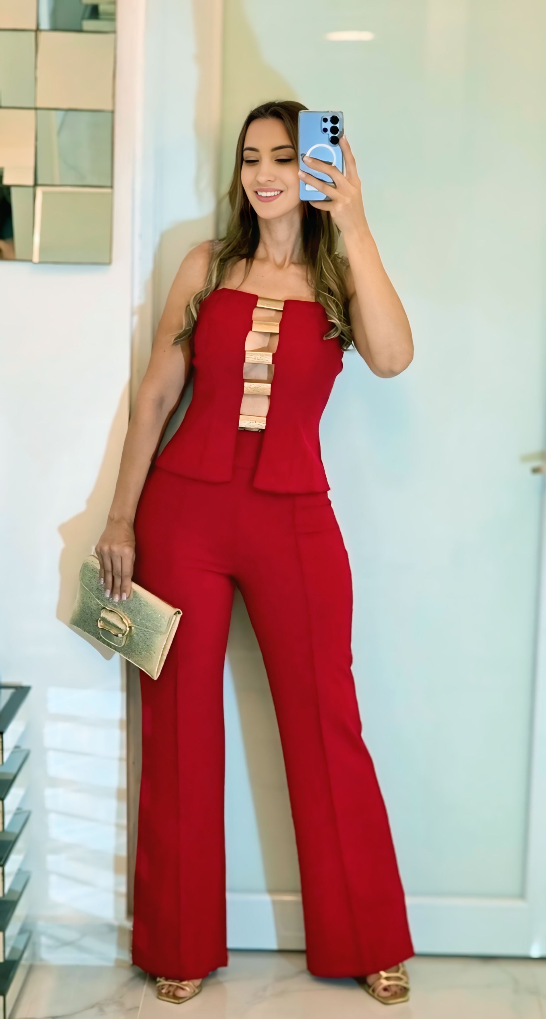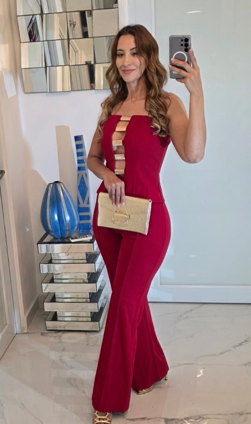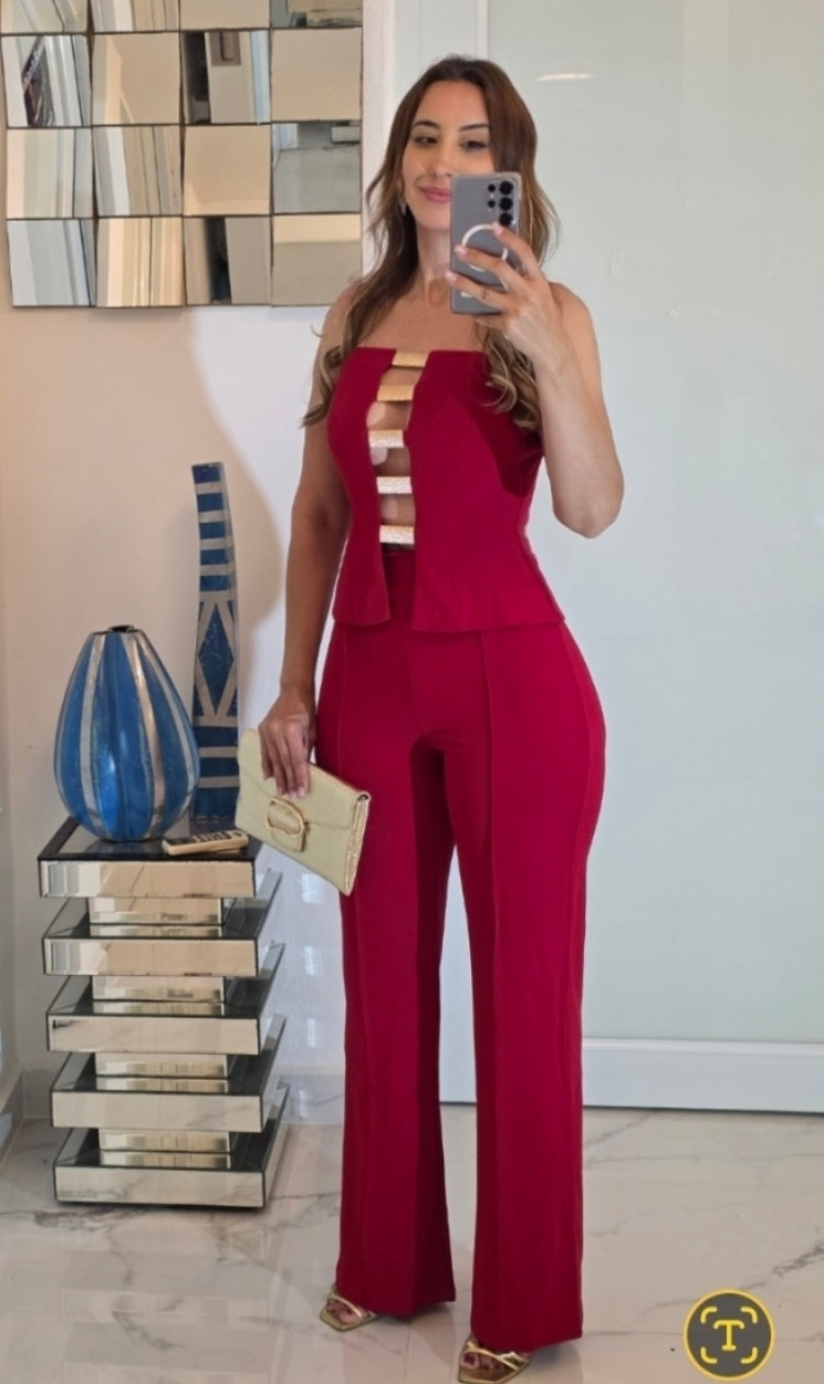 El pantalón de talle alto, corte recto y caída impecable alarga la figura, creando una silueta pulida y poderosa. Fabricado en un rojo rubí intenso, este conjunto transmite fuerza, seguridad y buen gusto, perfecto para eventos, cenas elegantes o fiestas donde quieras brillar sin esfuerzo.