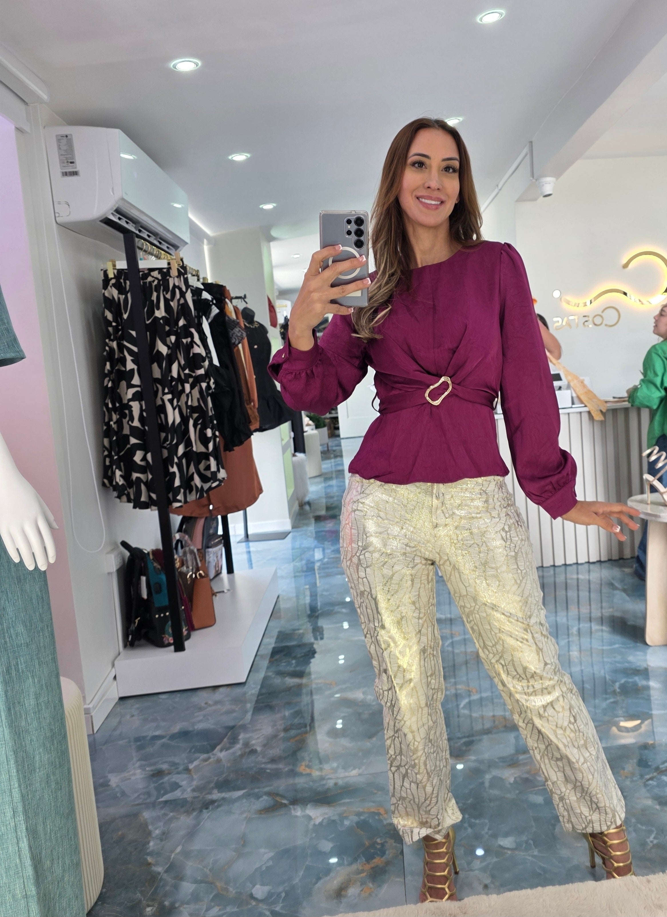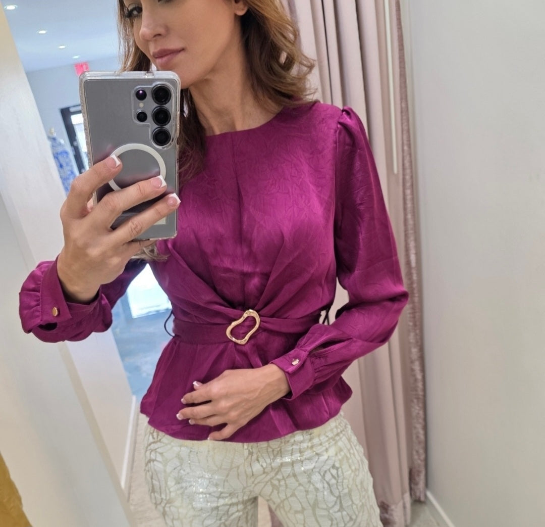 Elegancia pura ✨ Blusa satinada color berry con hebilla dorada en la cintura, combinada con pantalón crema con brillo dorado y textura artística. Un look sofisticado, femenino y con presencia.