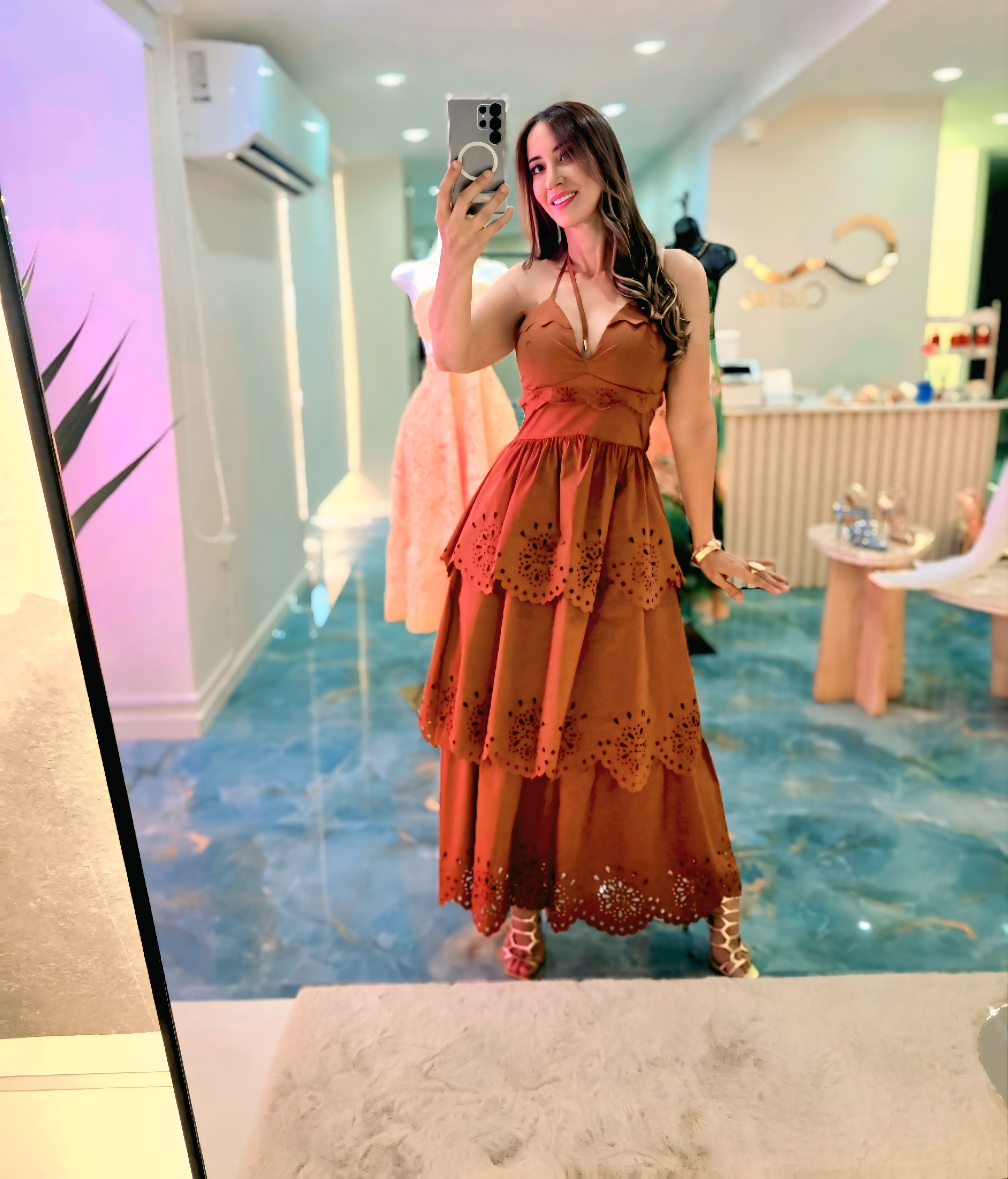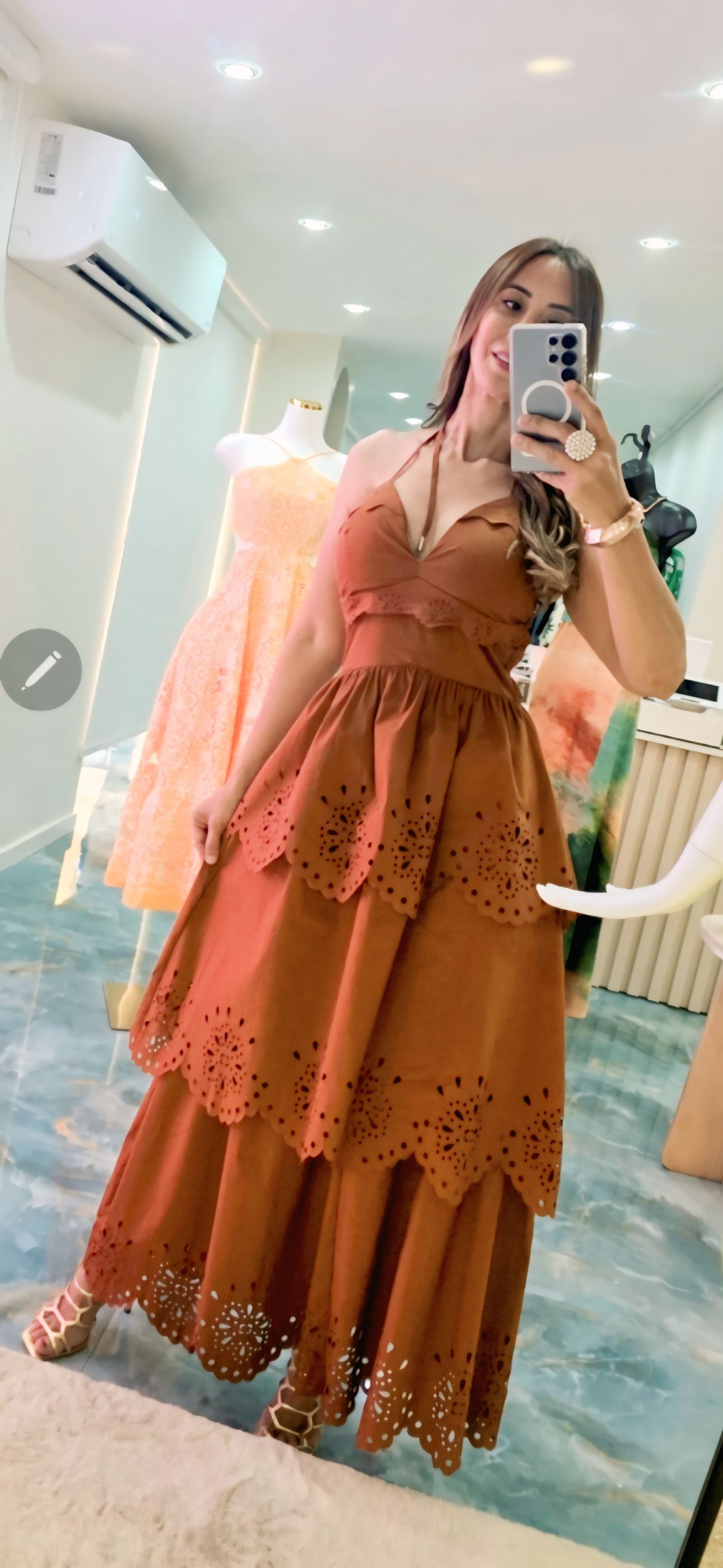 es una pieza larga y elegante que resalta la feminidad con sutileza. Su diseño de capas con bordado calado en corte láser le da un aire romántico y sofisticado, mientras que el escote corazón aporta un toque moderno y favorecedor.