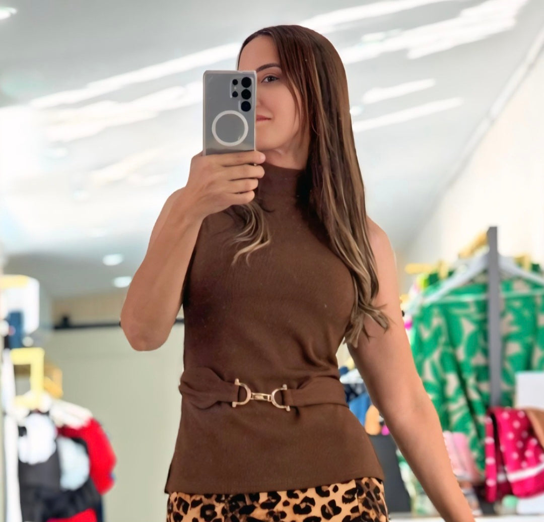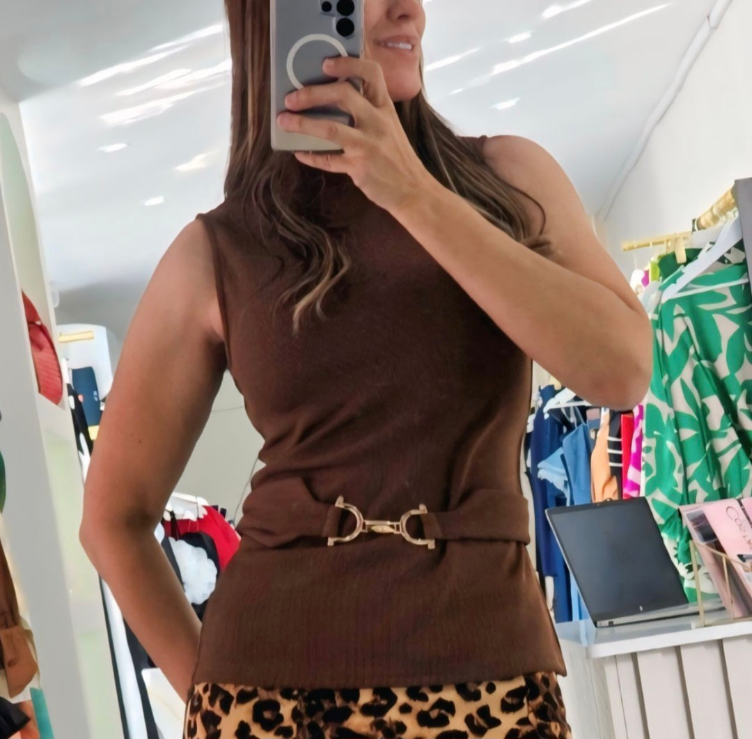 El top color bronce con detalle dorado es ideal para combinar con la falda sirena en Animal Print, resaltando los tonos tierra y la silueta con estilo.