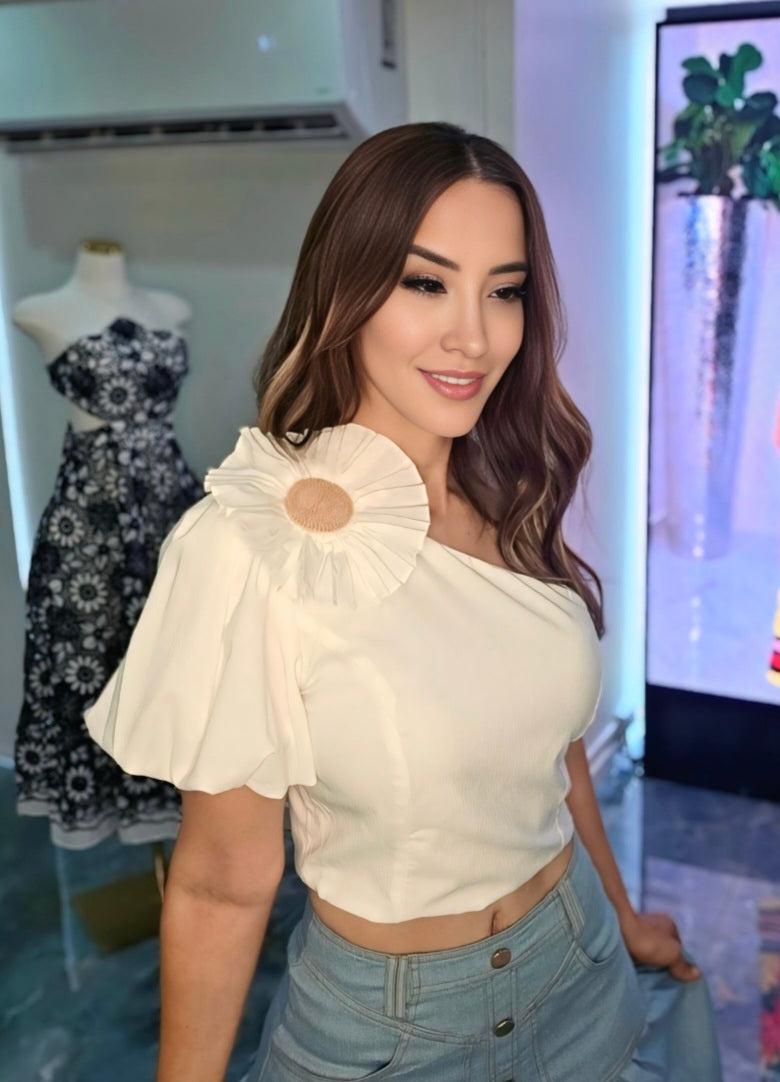 Eleva tu estilo con este top asimétrico en tono crema claro, diseñado para robar miradas. Su corte de un solo hombro aporta sofisticación, mientras que la manga abullonada luce adornada con un detalle floral plisado que realza la feminidad y el encanto de la prenda.